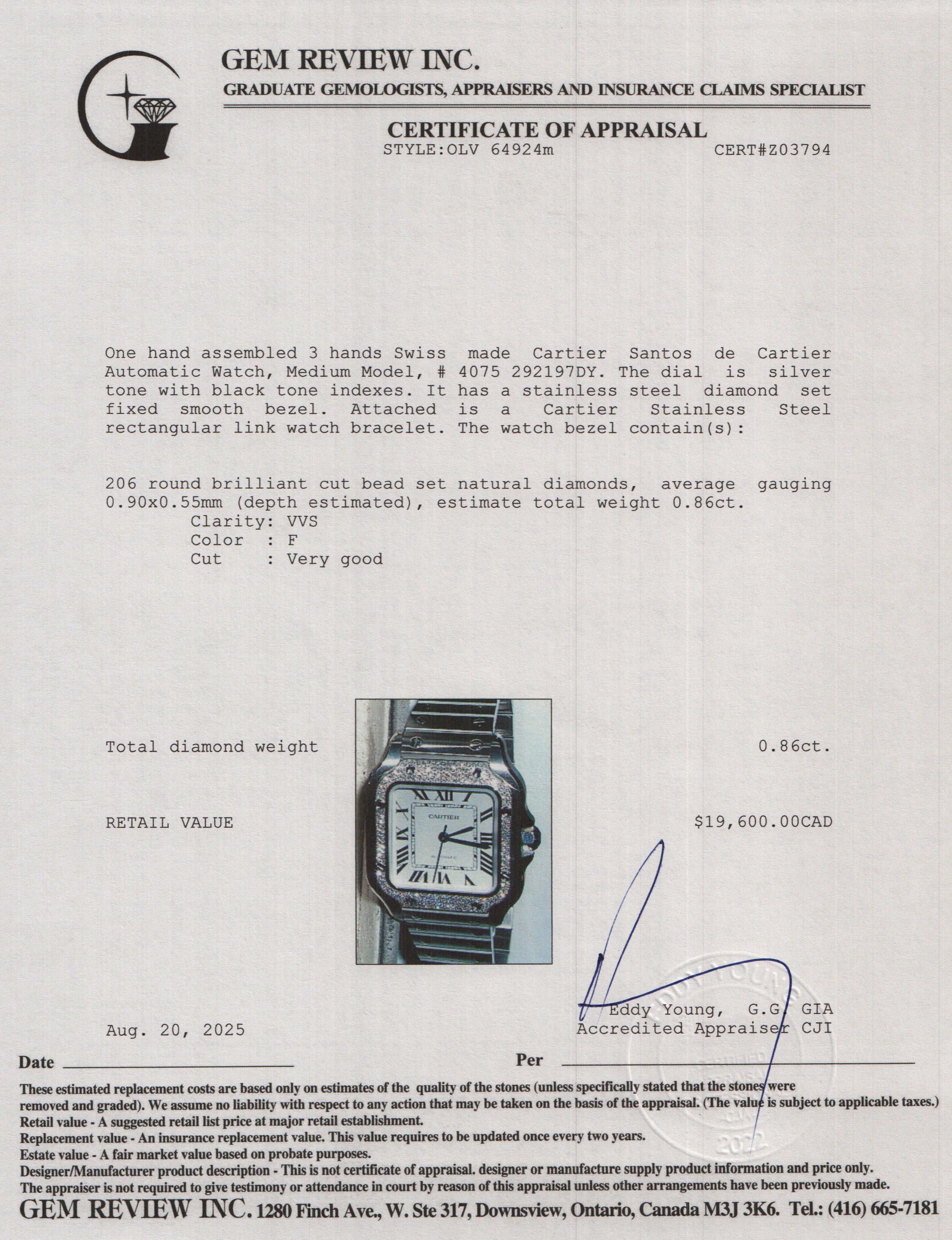 2023 Stainless Steel Diamond Bezel Santos de Automatic Watch, Medium Model 4075 w/ Box, Papers & Extra Leather Strap
