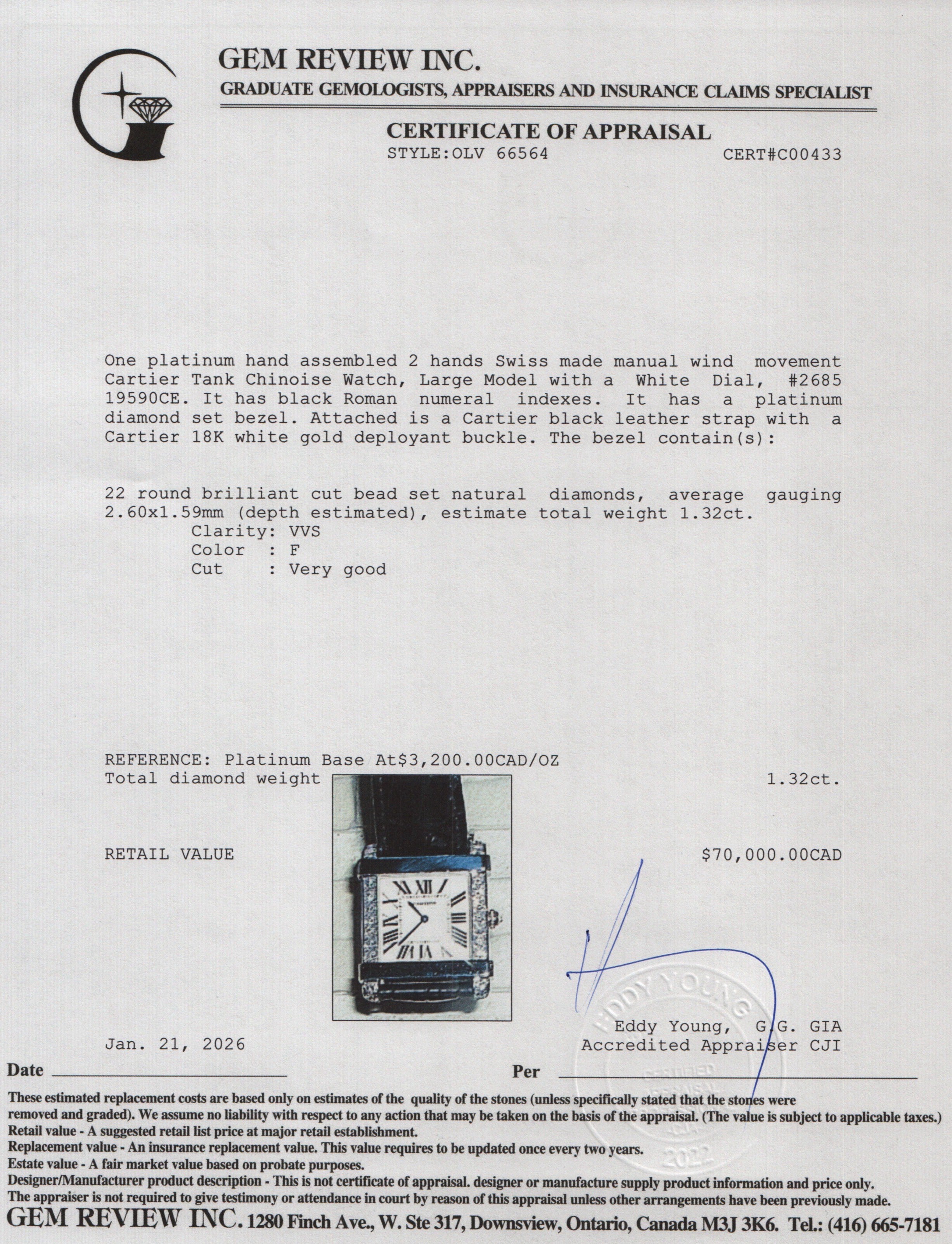 Platinum Diamond Bezel Tank Chinoise Watch, Large Model White Dial 2685 w/ Box