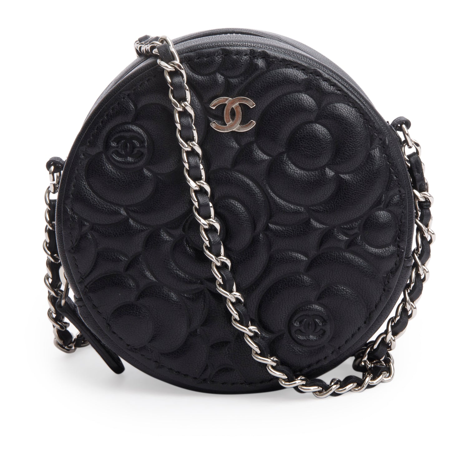 Black Caviar Camellia Embossed Round Clutch w/ Box & Authenticity Card