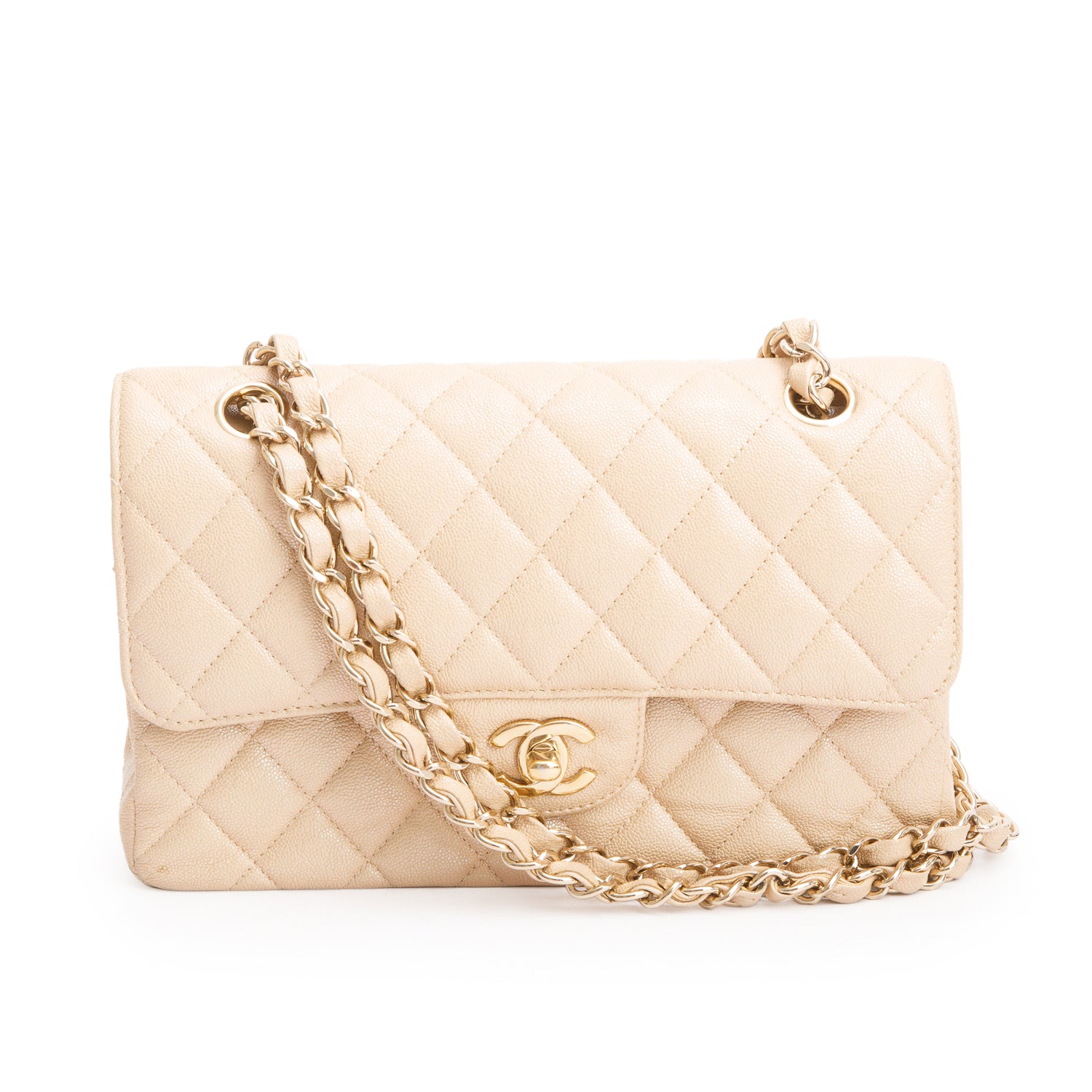 Iridescent Beige Caviar Quilted Small Double Flap Bag