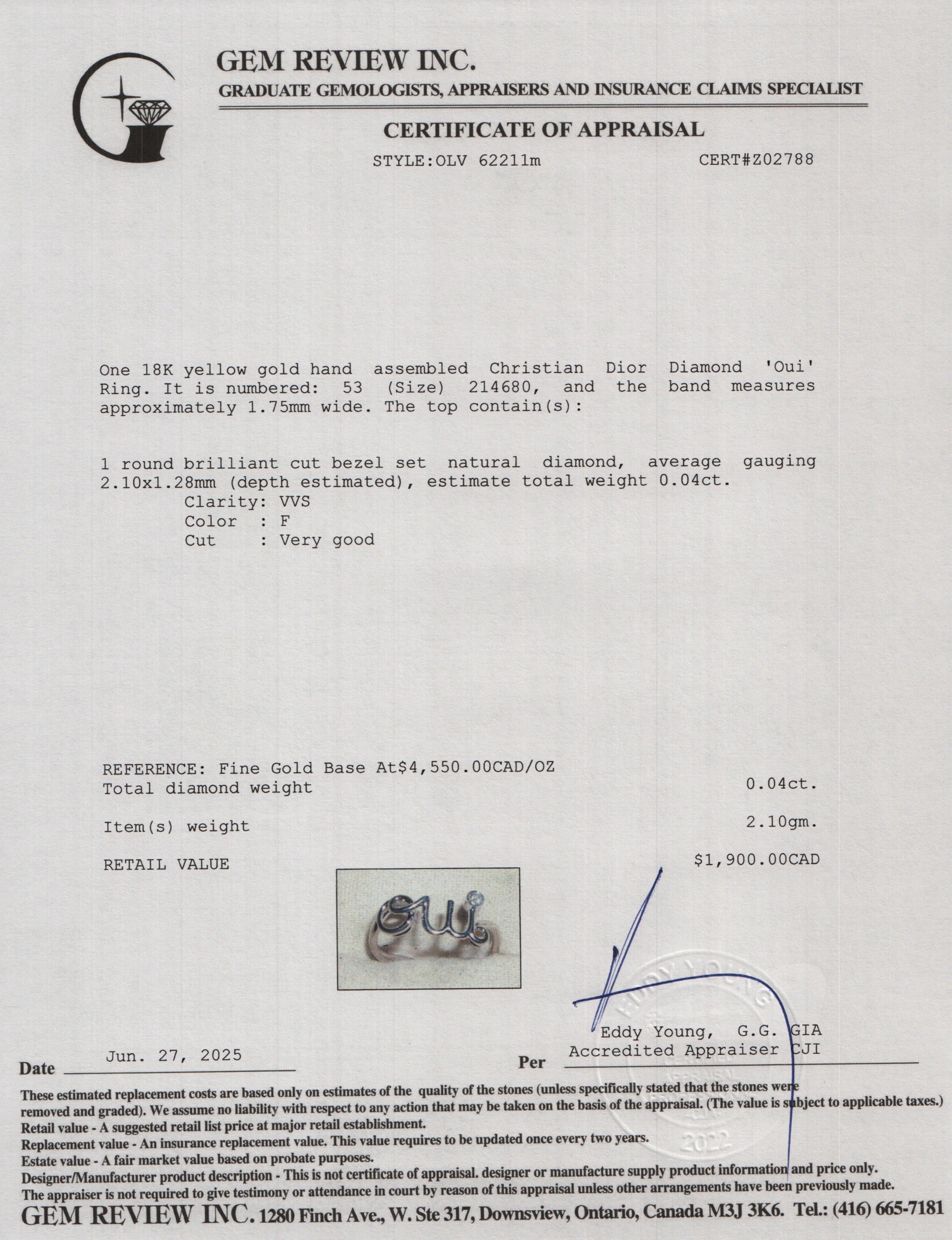 18k White Gold Diamond 'Oui' Ring, Size 53 6.75 w/ Box & Certificate