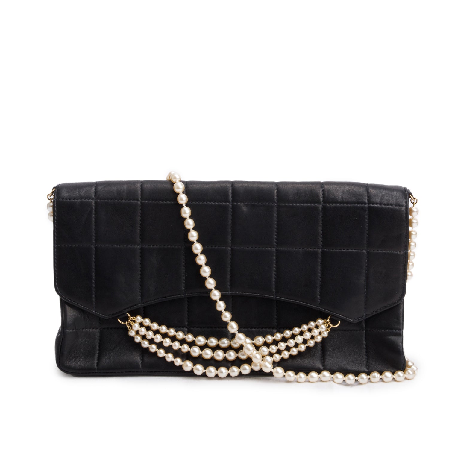 Vintage Black Lambskin Quilted Chocolate Bar Pearl Flap Bag w/ Authenticity Card