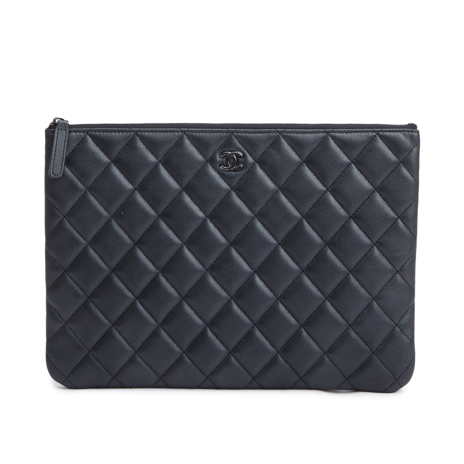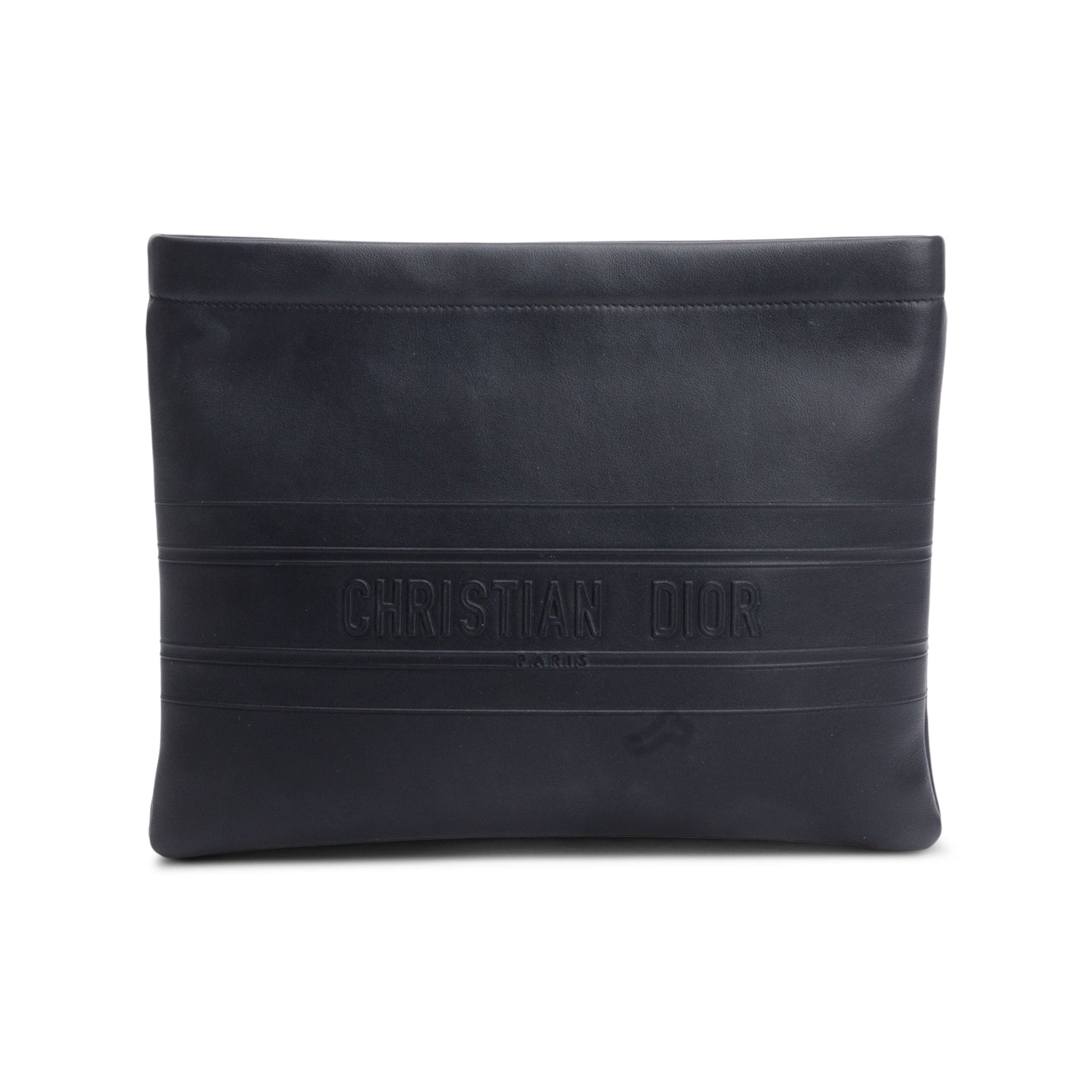 Black calfskin Leather Logo Strip Zip Pouch w/ Authenticity Card