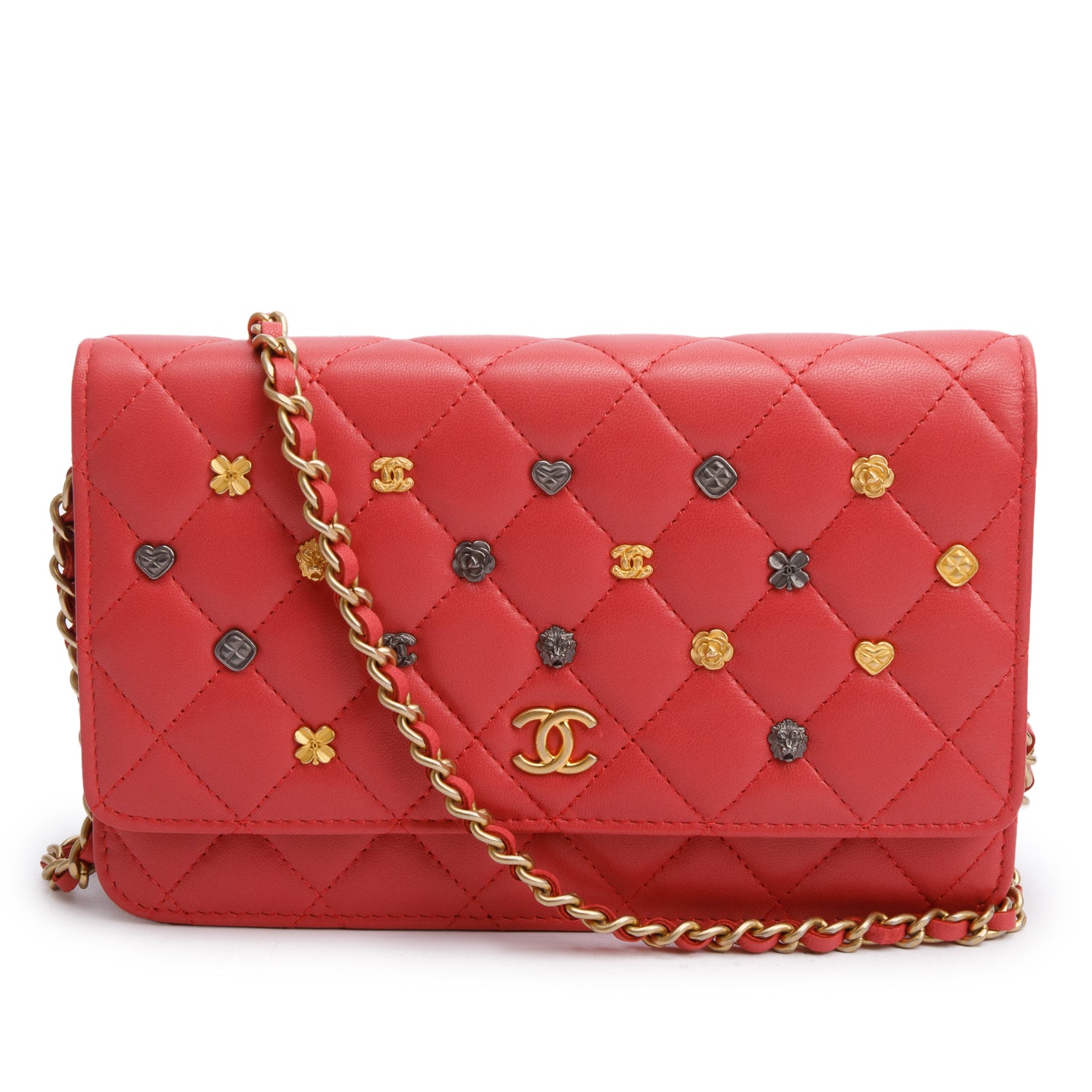 Pink Quilted Lambskin Leather 18k Lucky Charms Wallet on Chain w/ Box
