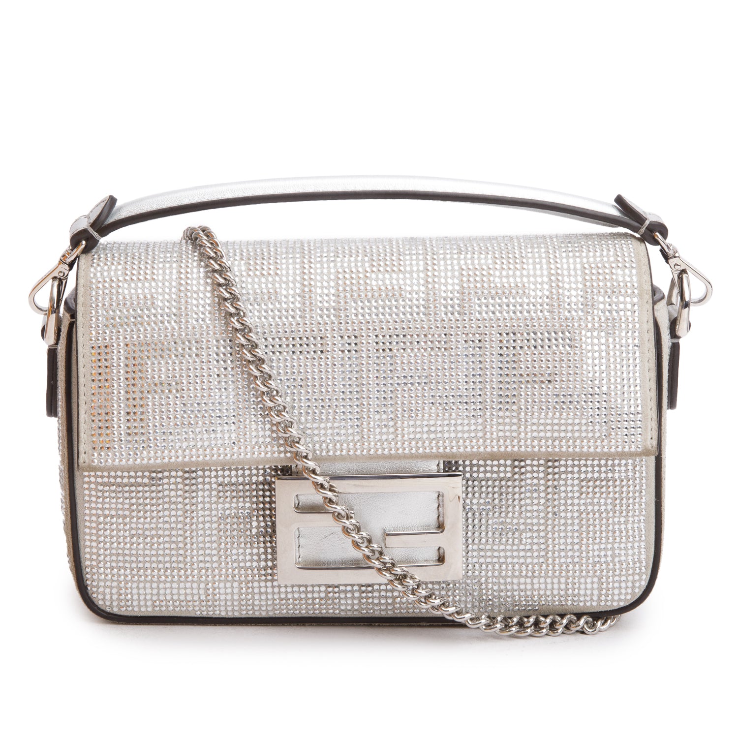 2024 Silver FF Suede Crystal Mini Be Baguette Chain Crossbody w/ Straps & Box