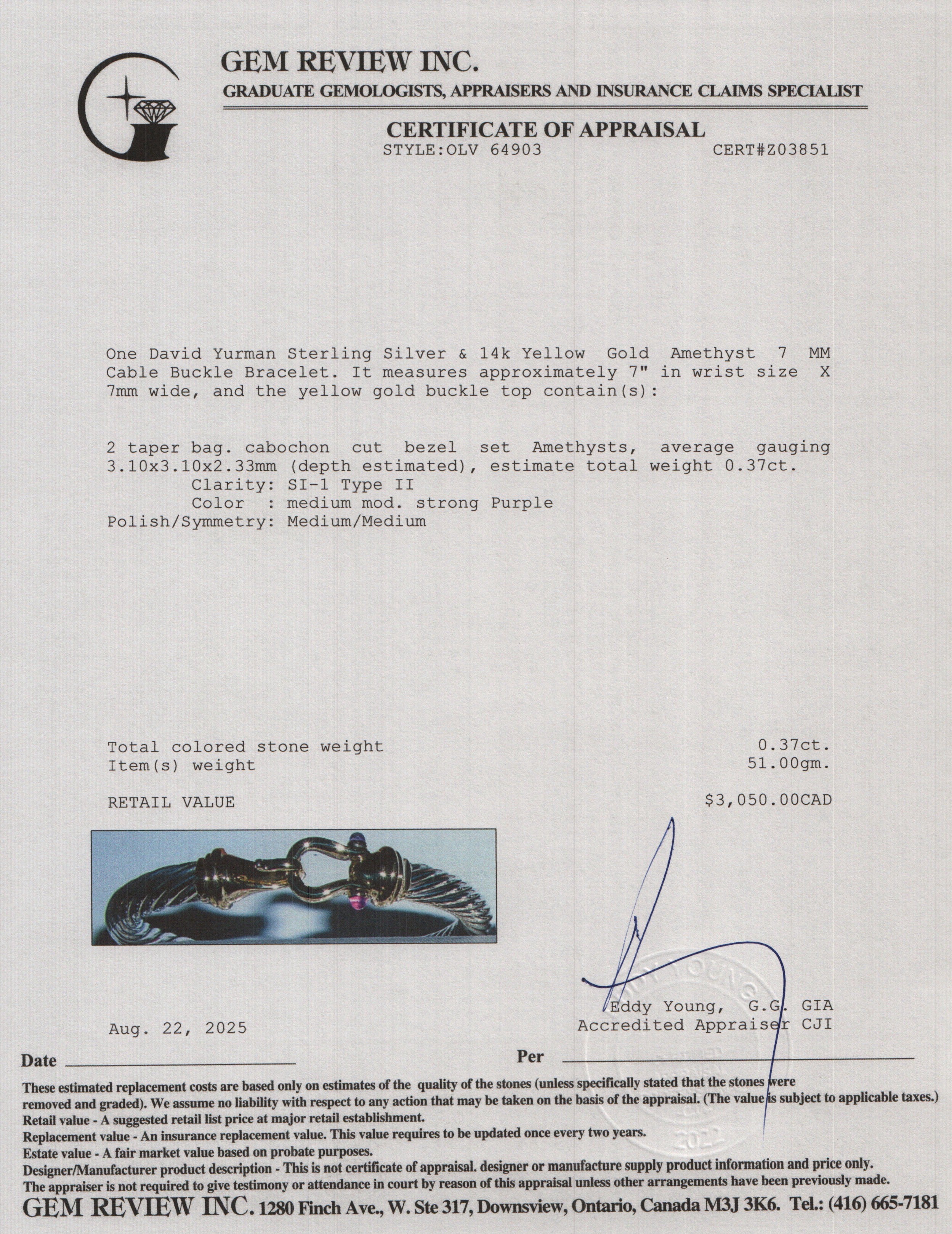 Sterling Silver & 14k Yellow Gold Amethyst 7 MM Cable Buckle Bracelet