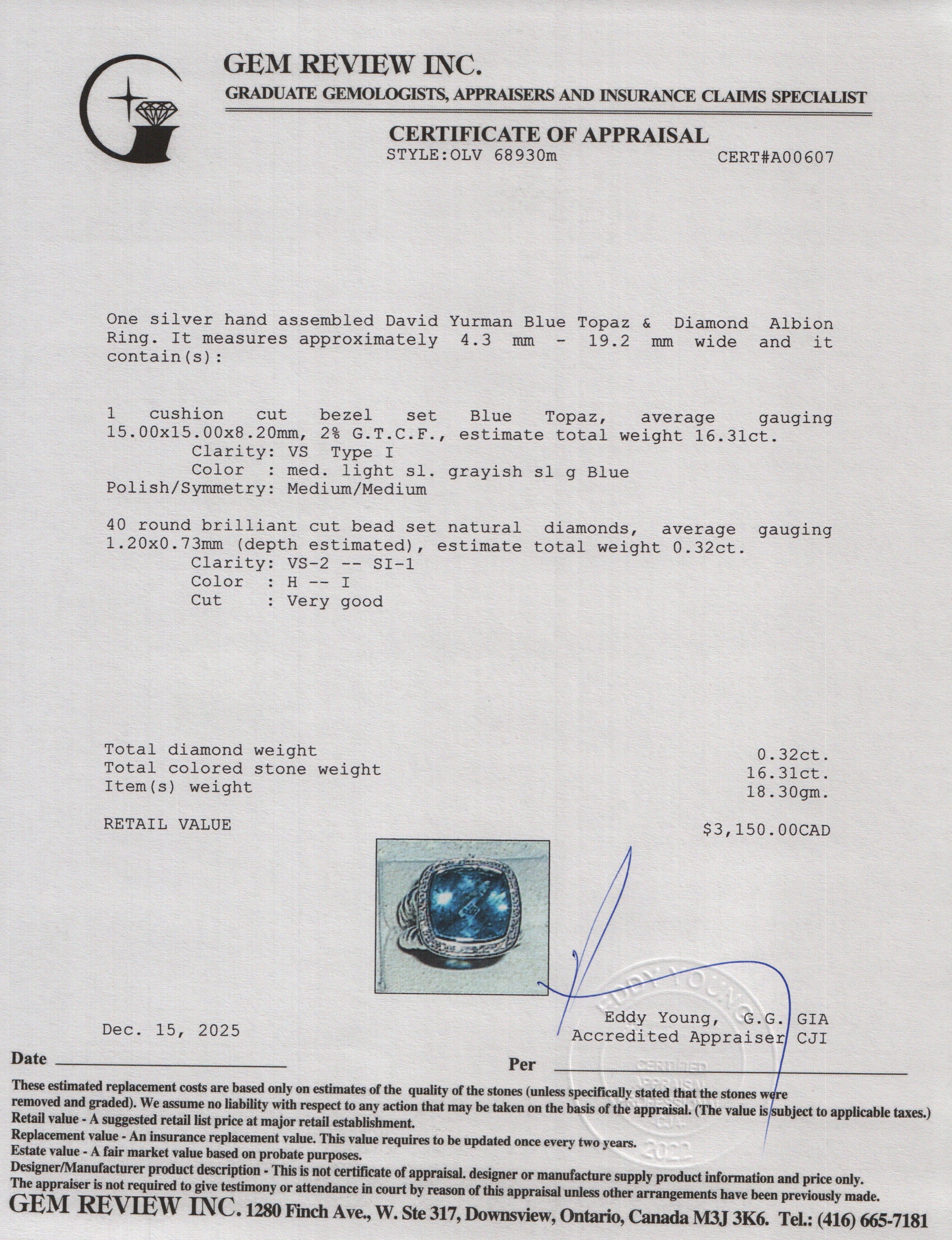 Sterling Silver 15 MM Blue Topaz & Diamond Albion Ring, Size 6