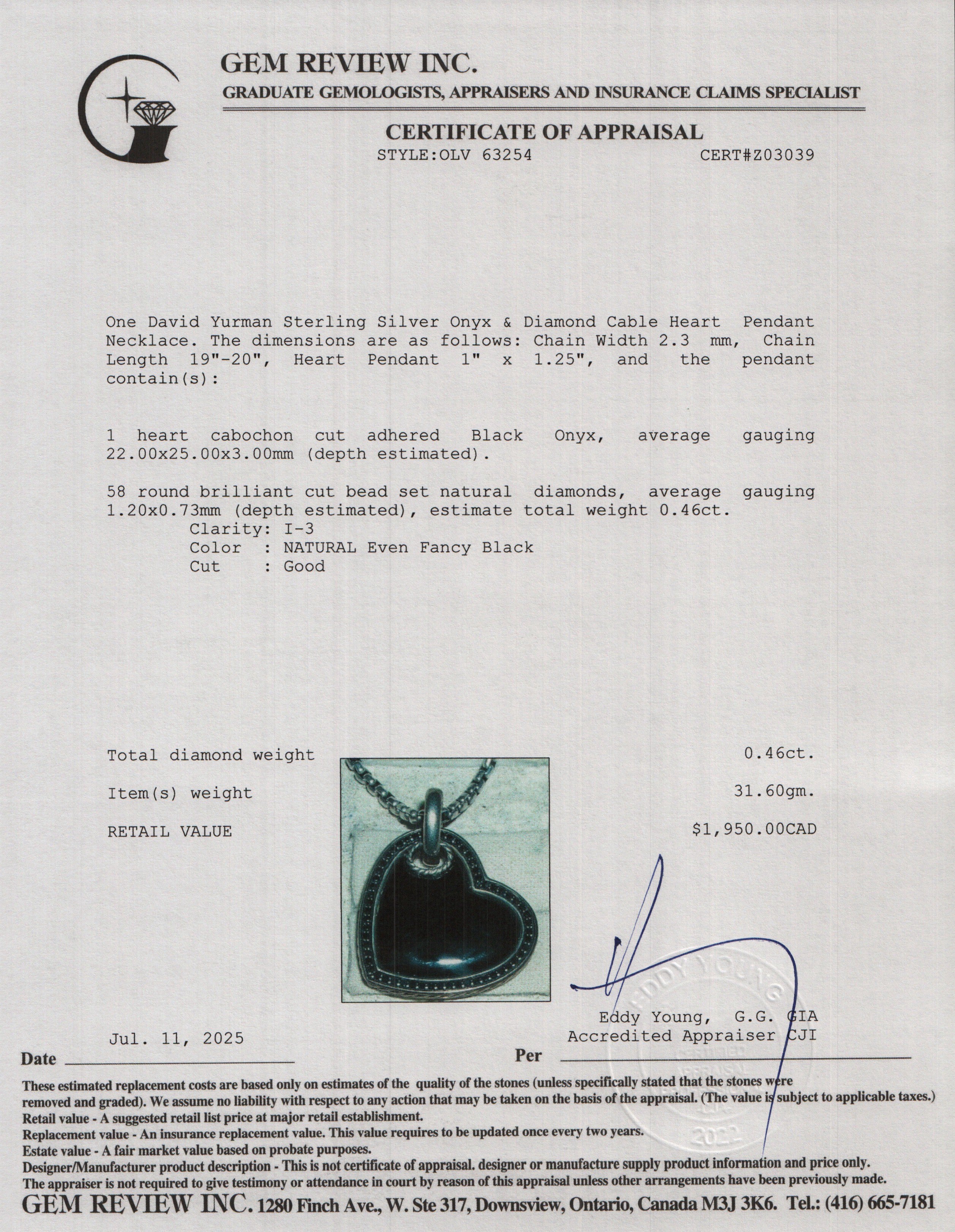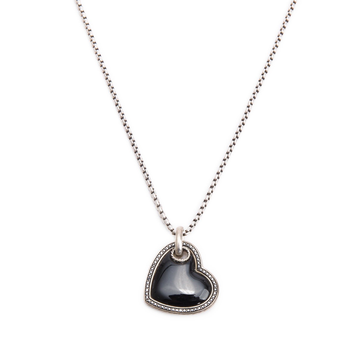Sterling Silver Onyx & Diamond Cable Heart Pendant Necklace