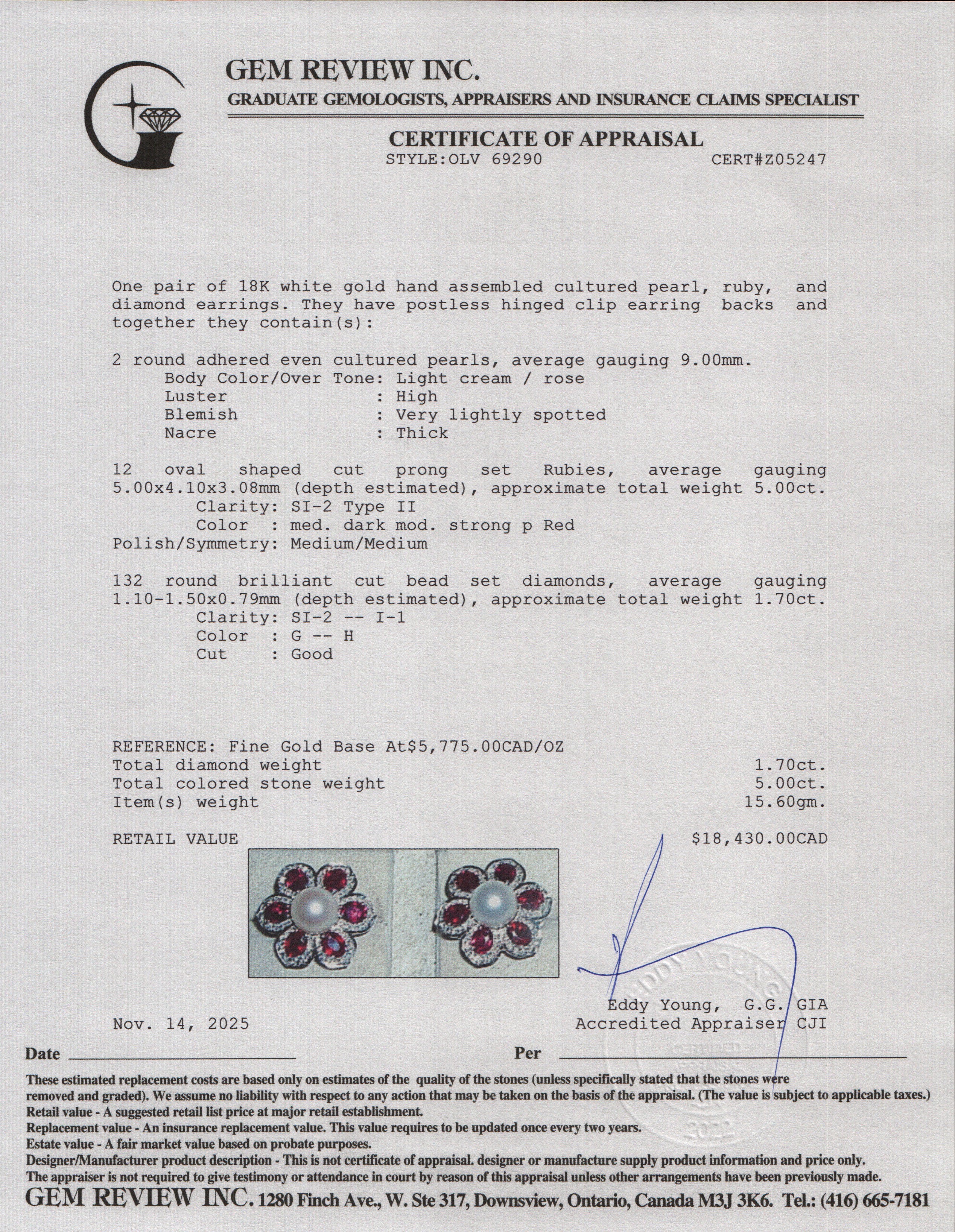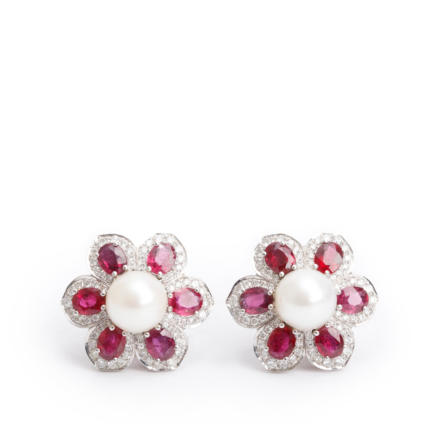 18k White Gold Ruby, Pearl & Diamond Flower Clip-On Earrings