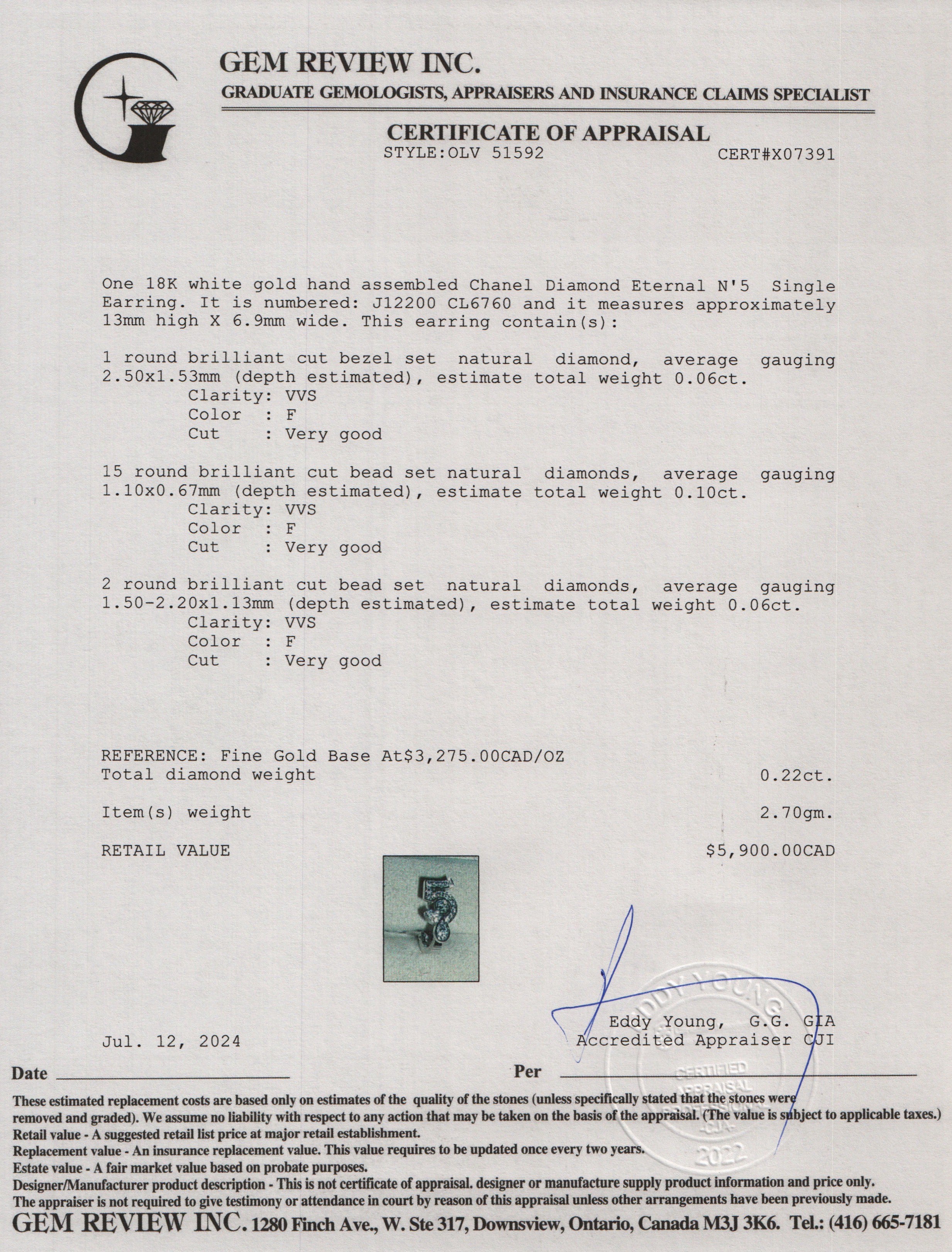 2024 18k White Gold Diamond Eternal N'5 Single Earring w/ Box & Receipt