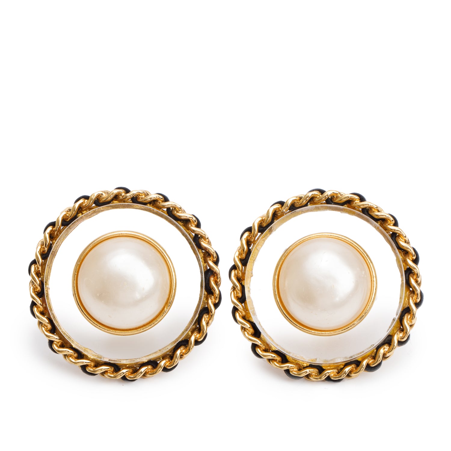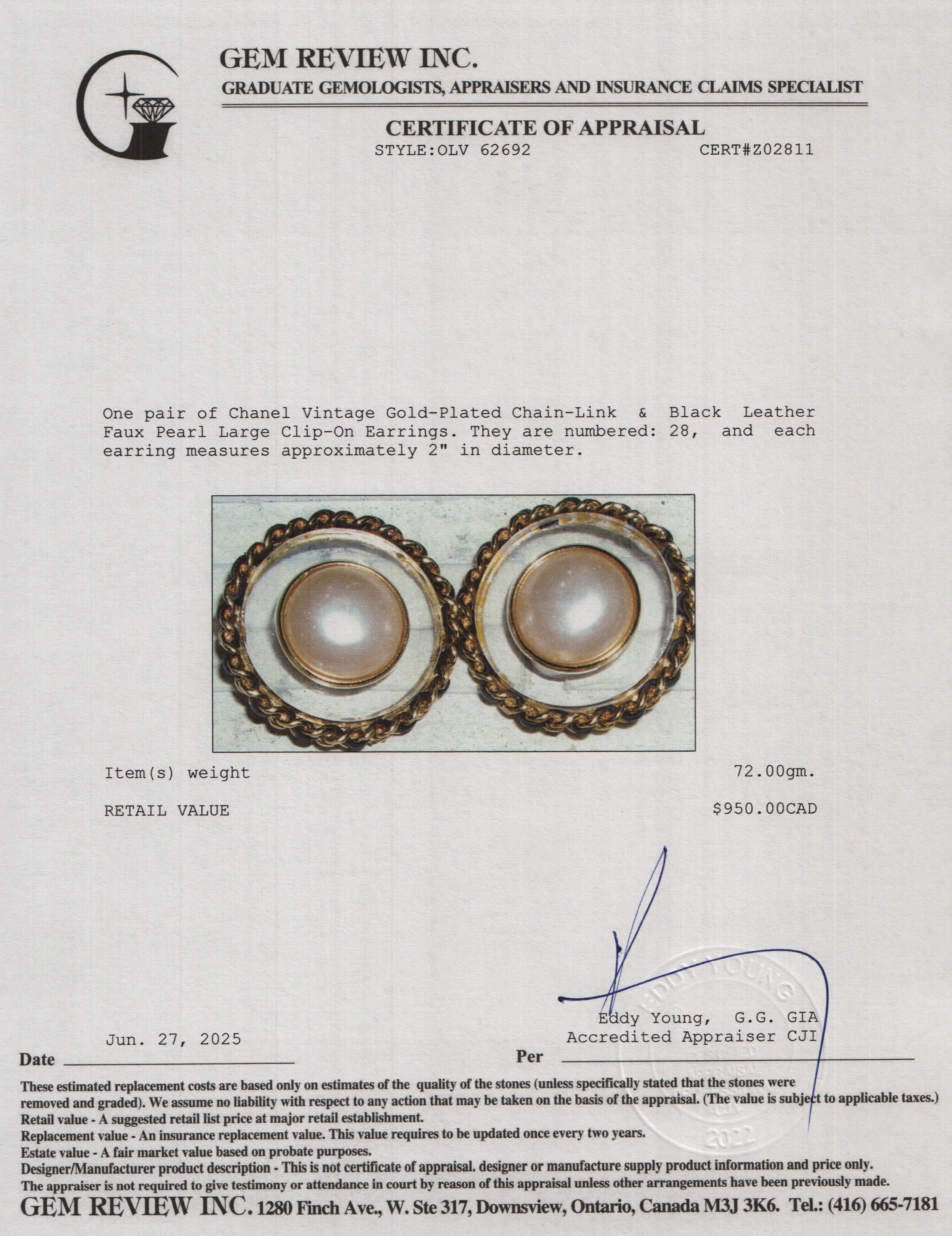 Vintage Gold-Plated Chain-Link & Black Leather Faux Pearl Large Clip-On Earrings