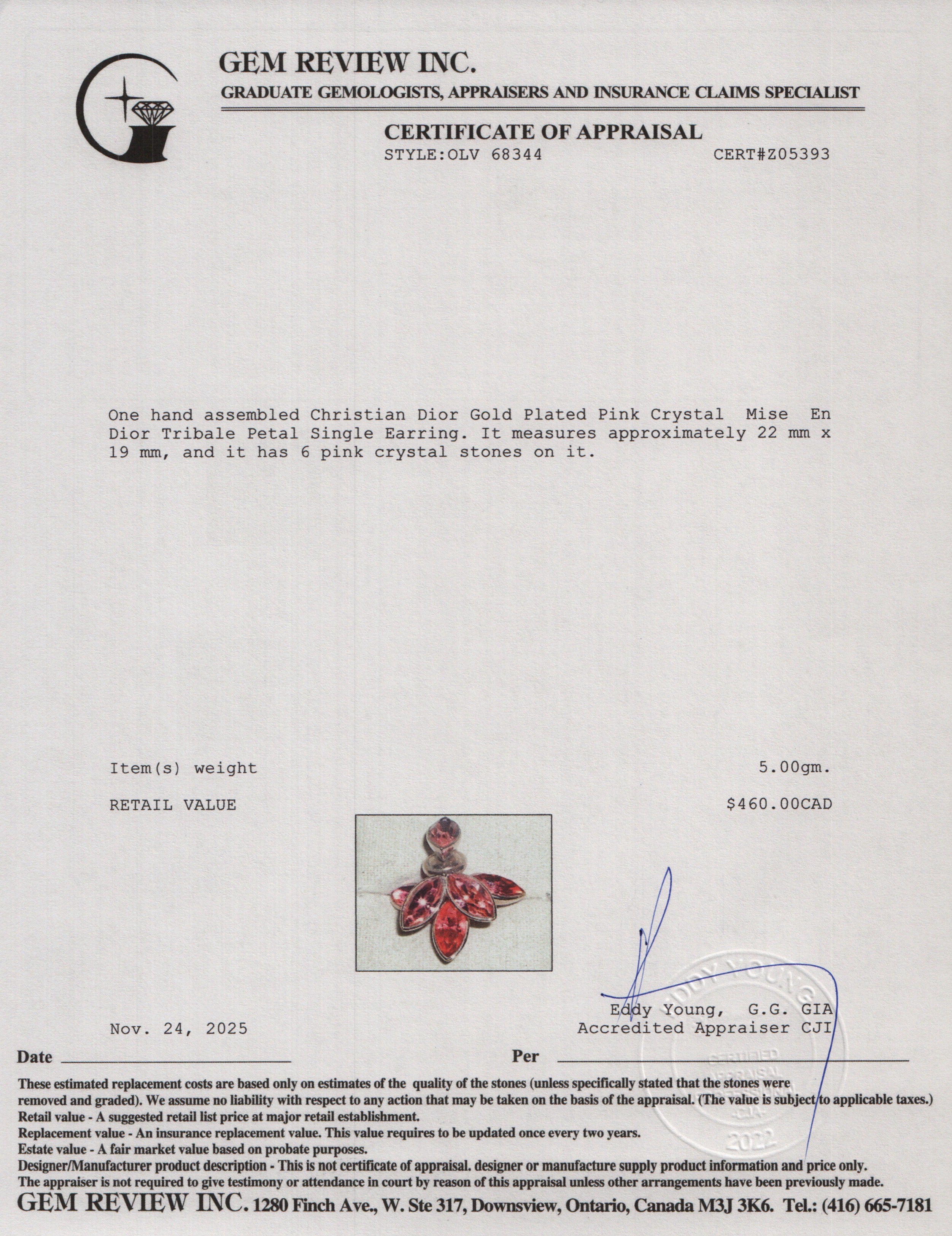 Gold Plated Pink Crystal Mise En Dior Tribale Petal Single Earring