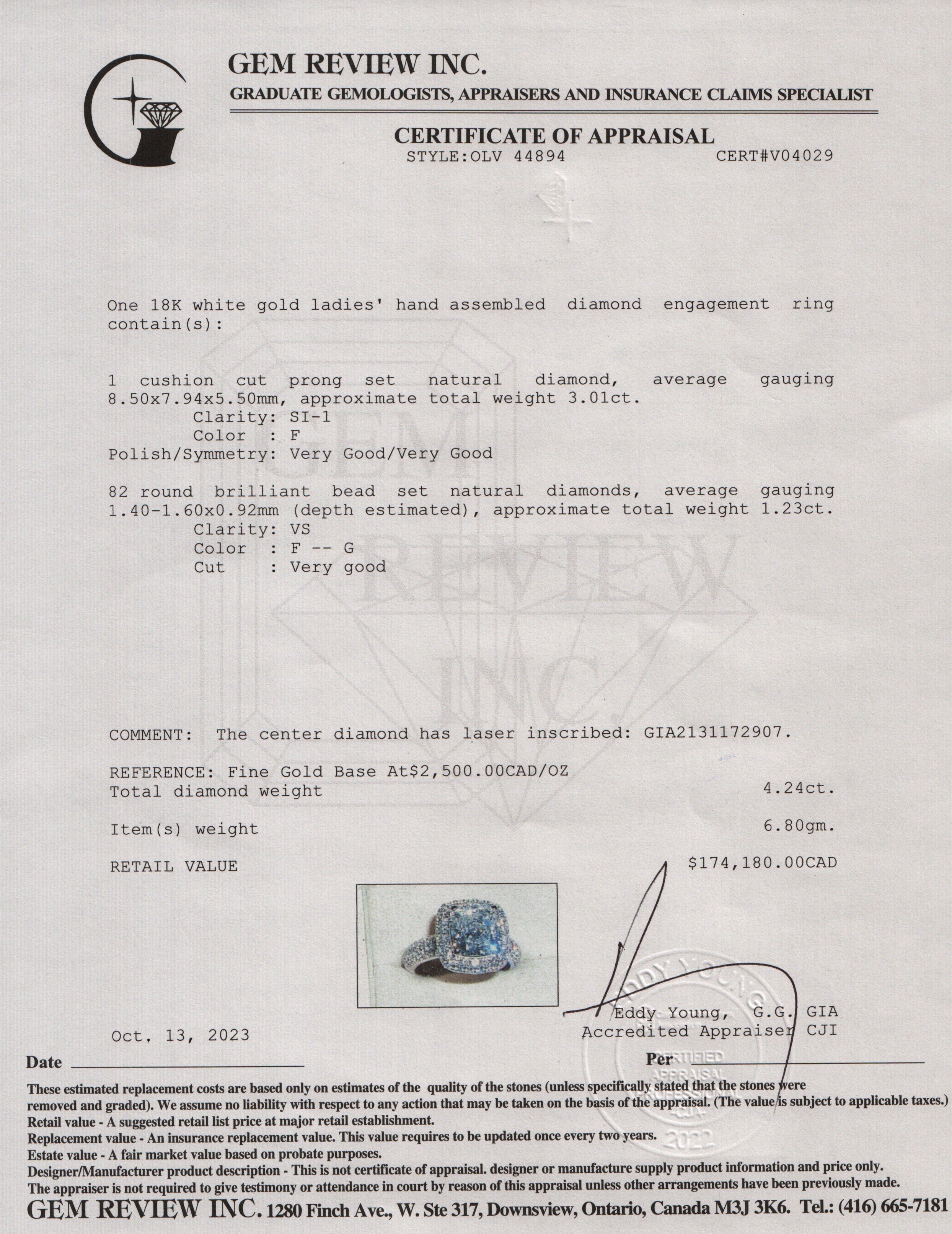 18k White Gold 3.01 ct. Cushion Cut Diamond Engagement Ring, Size 5.25 w/ GIA Diamond Certificate