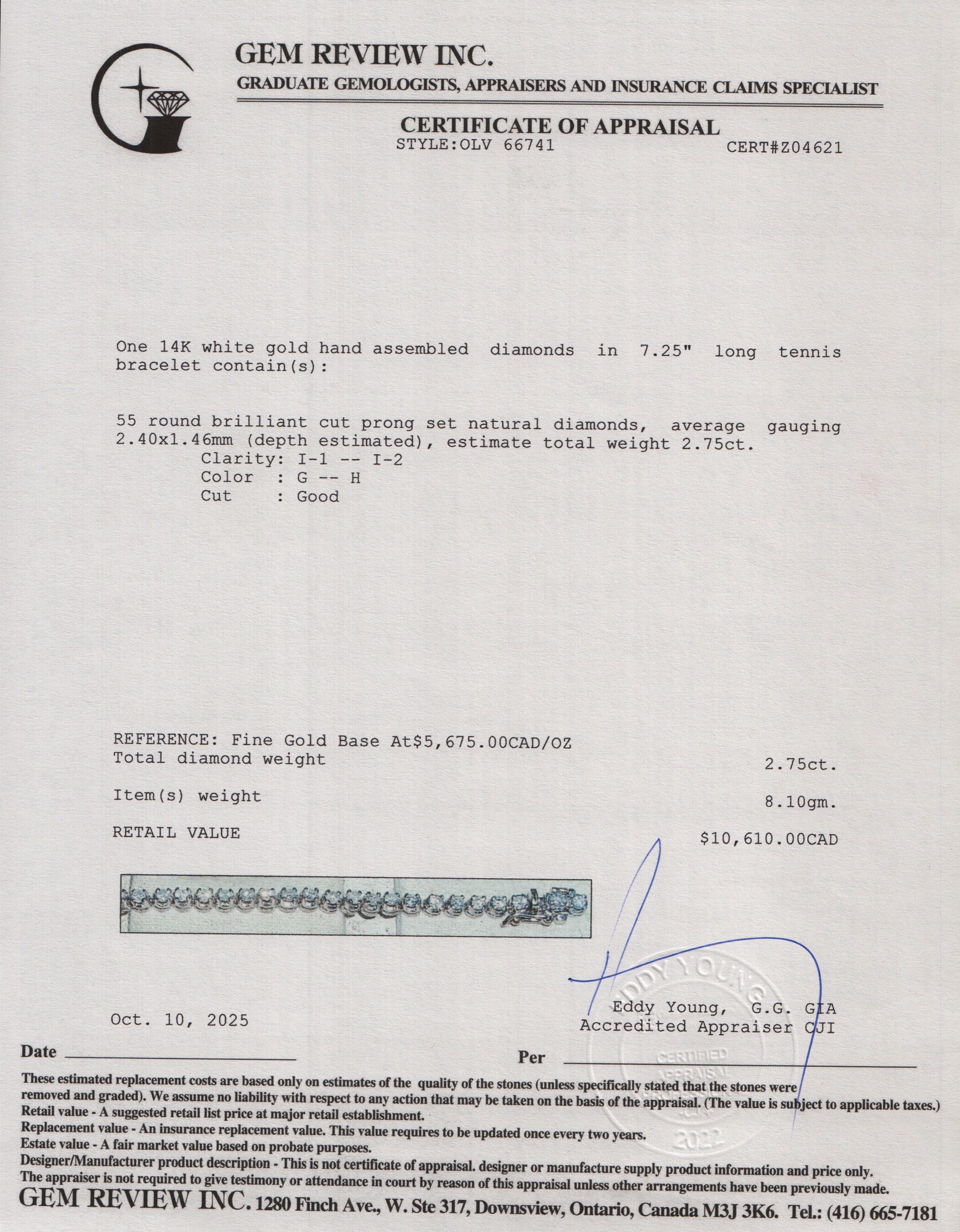 14k White Gold 2.75 tcw. Diamond Tennis Bracelet