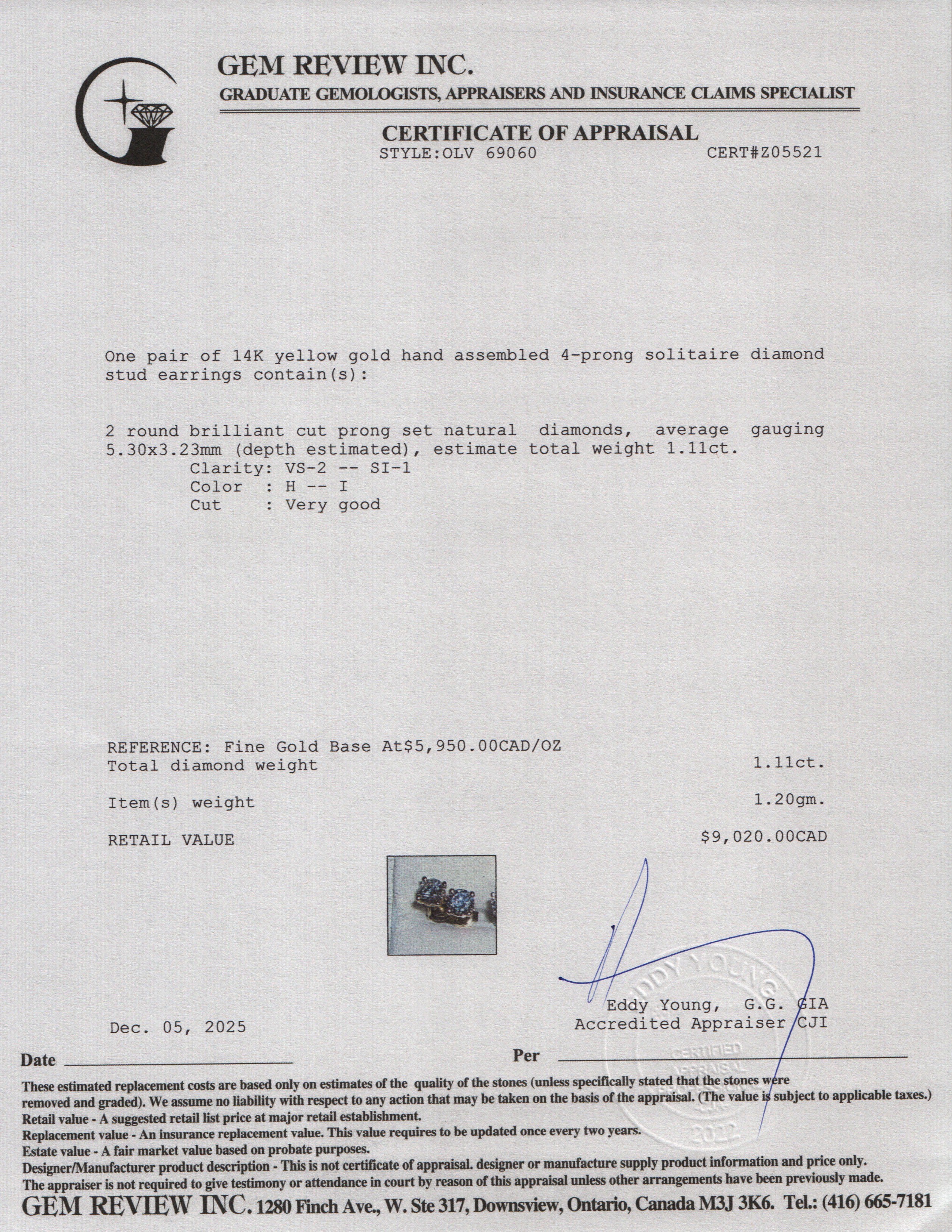 14k Yellow Gold 1.11 tcw. Diamond Stud Earrings