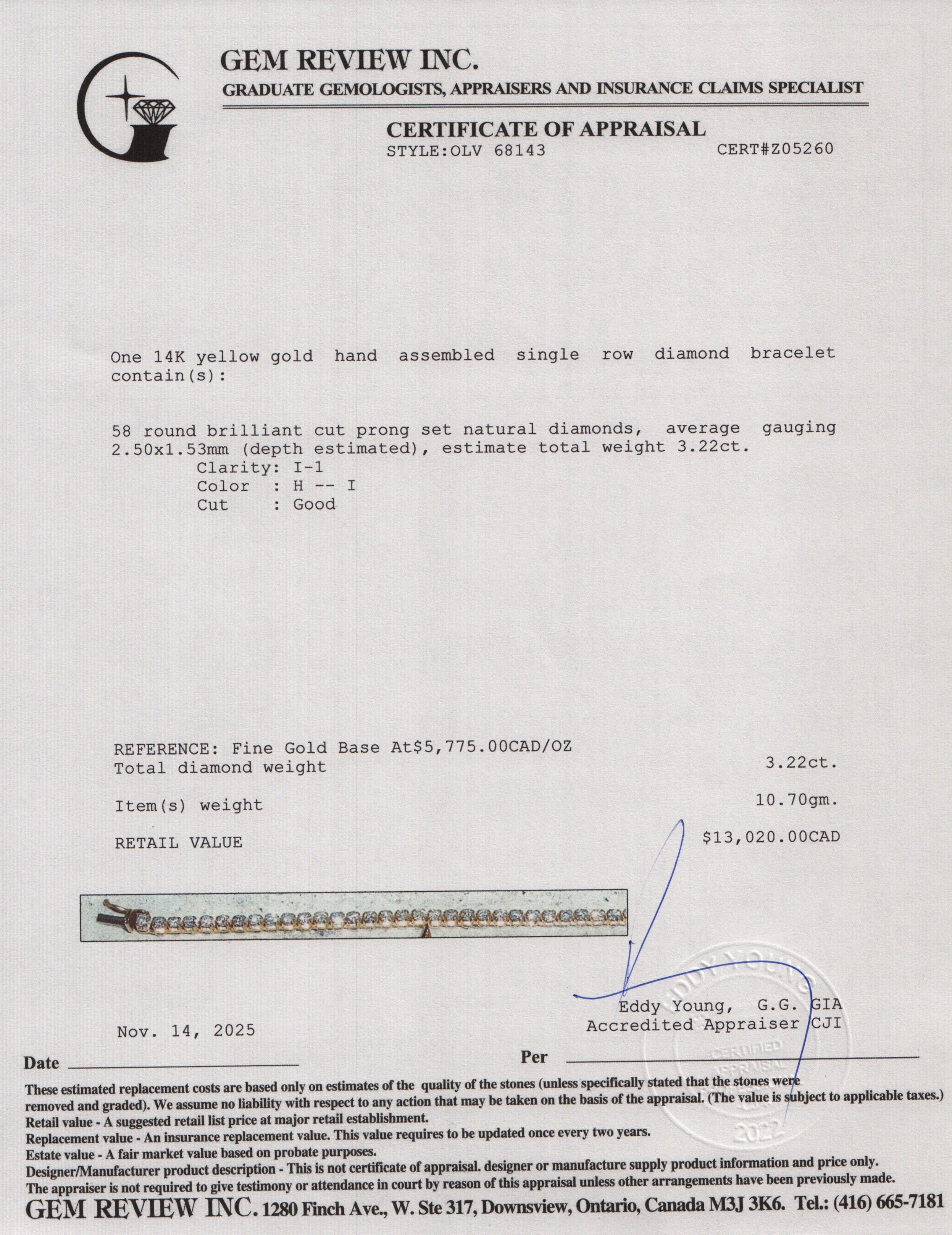 14k Yellow Gold 3.22 tcw. Diamond Tennis Bracelet