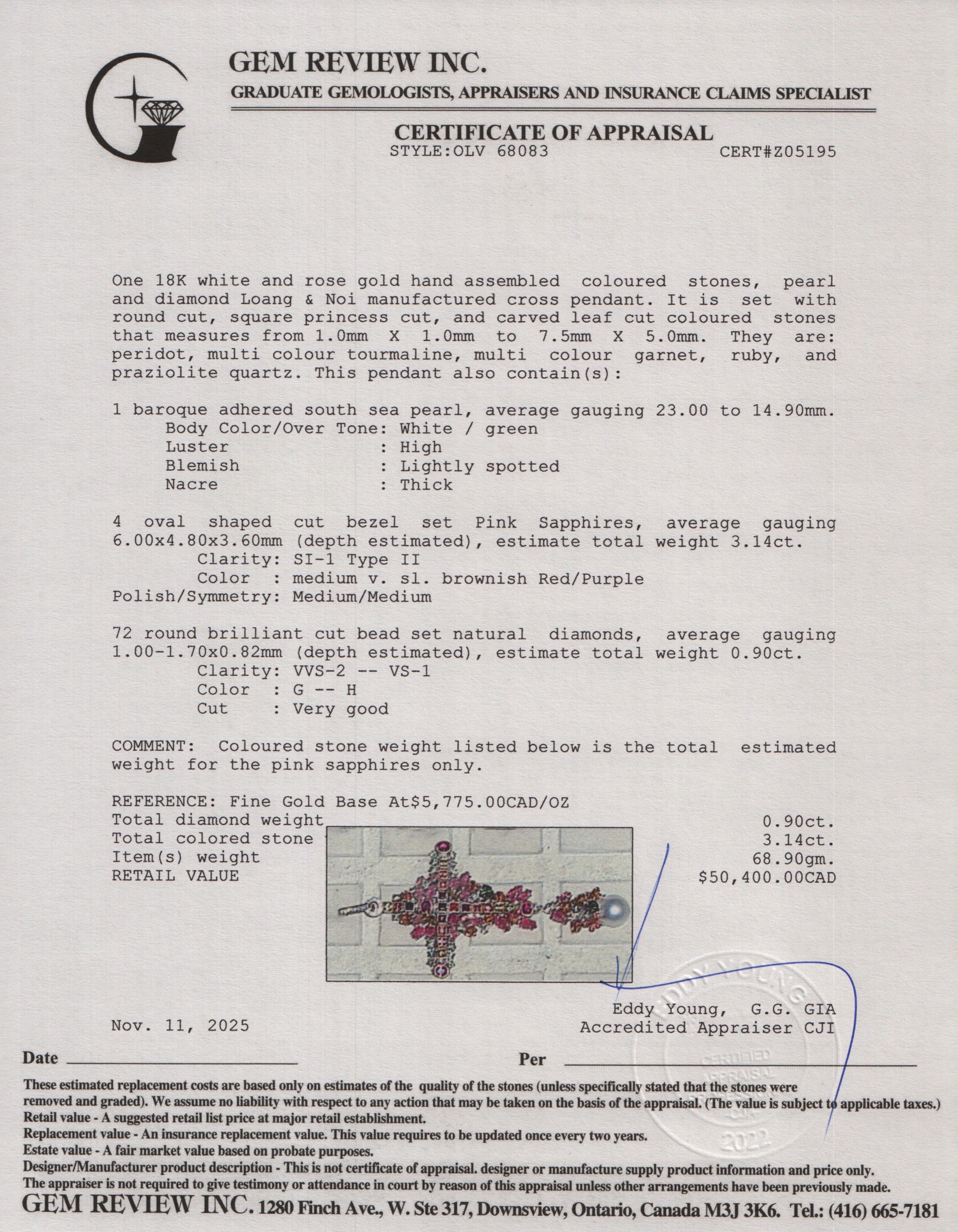 18k White Gold Colored Stone, Diamond & Pearl Large Cross Pendant