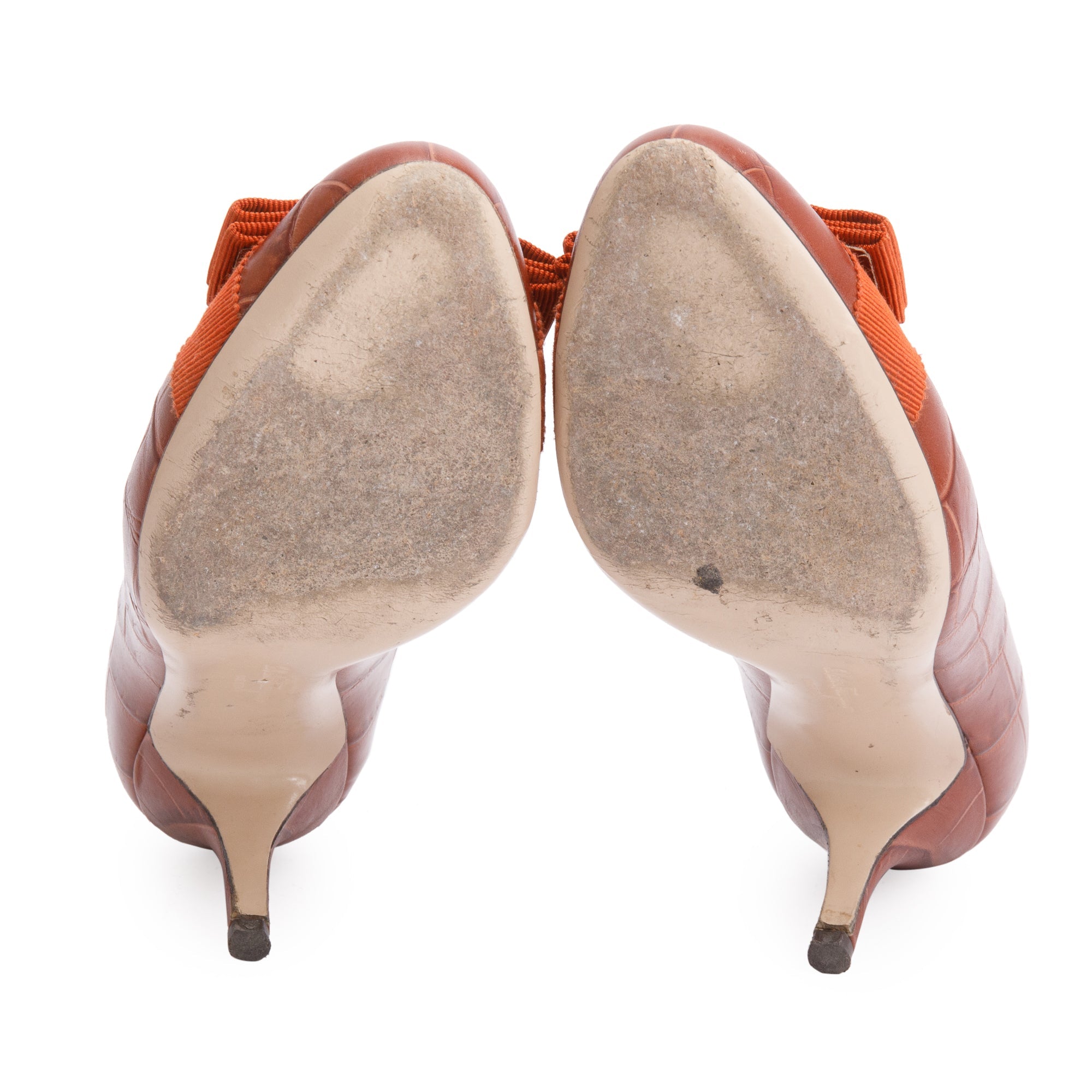 Salvatore Brown Croc-Embossed Leather Vara Bow Pumps, Size 6