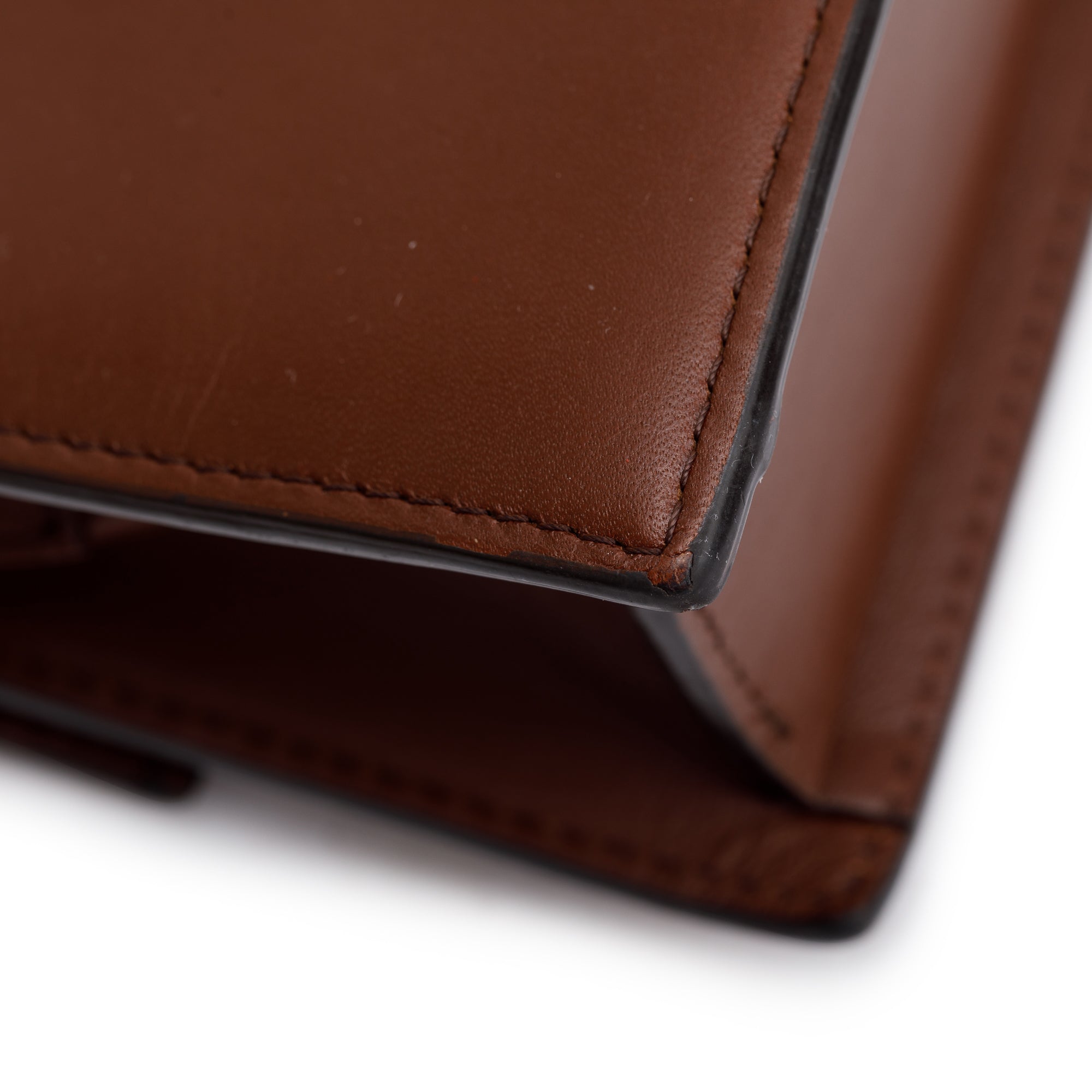 Condition: Good; slight scratches and tarnishing at hardware; slight scratches and scuffing at exterior leather and corners; light marks and scratches at interior