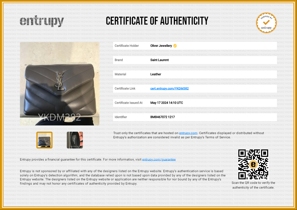 Dust Bag, Strap, Entrupy Certificate of Authenticity