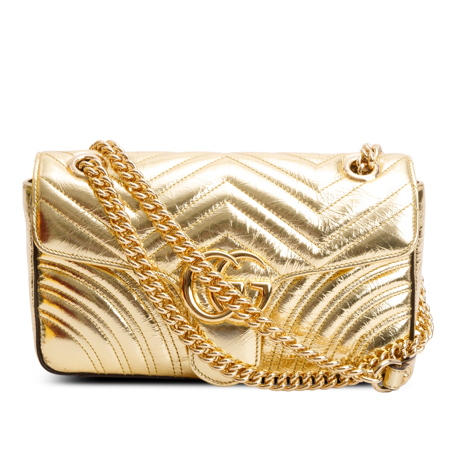 Gold Metallic Crinkled Calfskin Matelasse Medium GG Marmont Shoulder Bag w/ Box