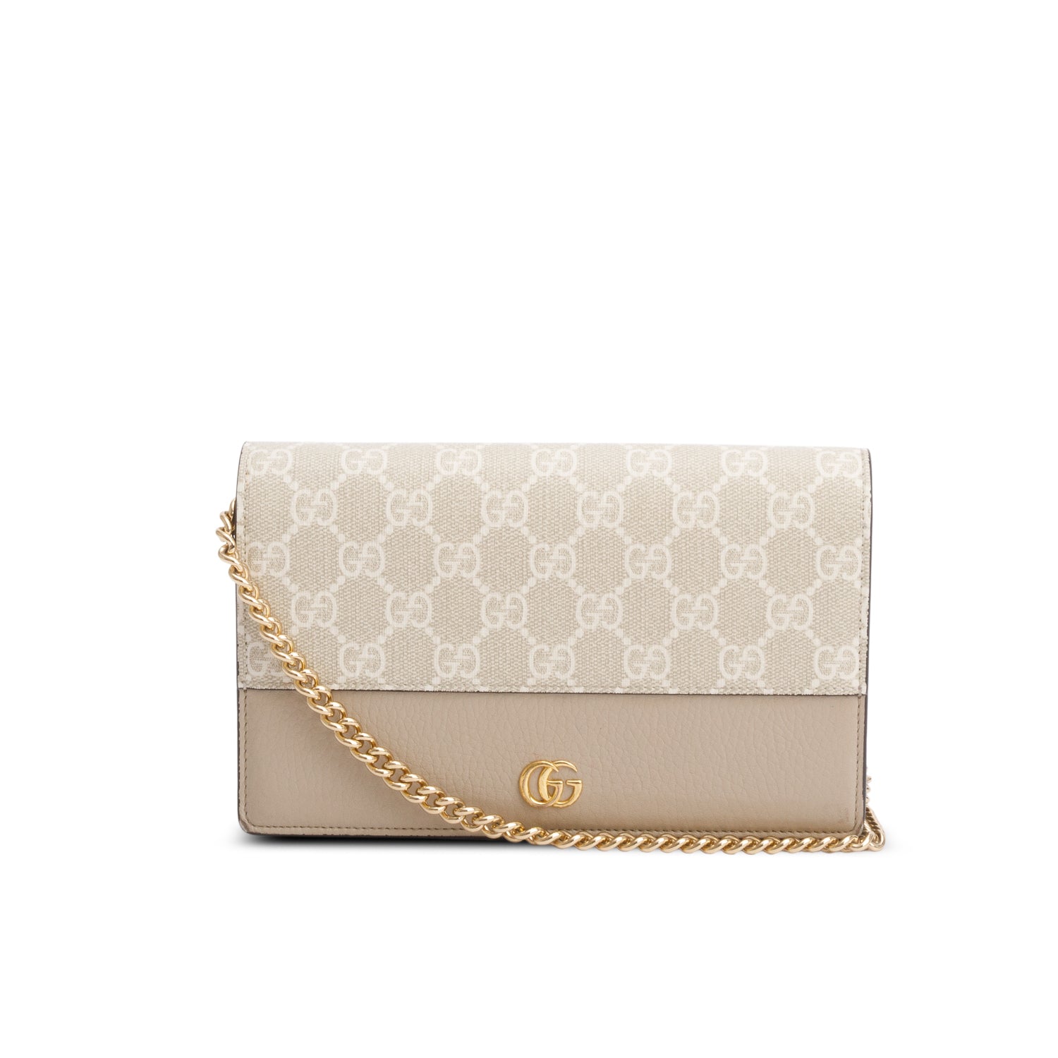 Beige GG Supreme Monogram Textured Dollar Calfskin Mini GG Marmont Chain Wallet w/ Box
