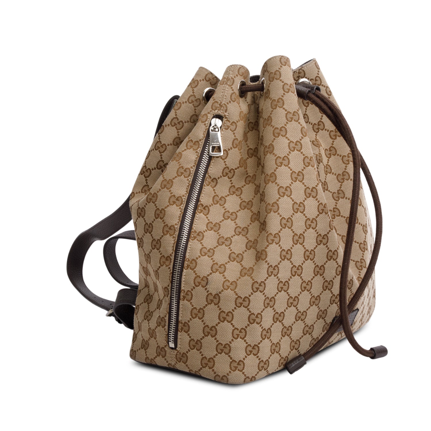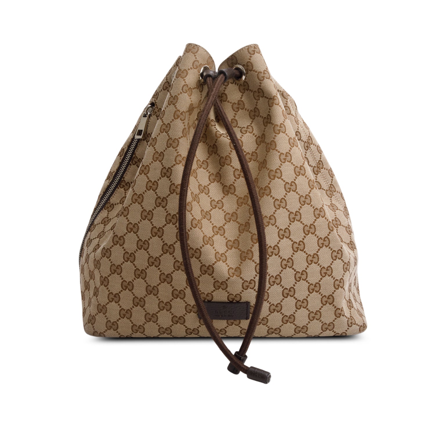 Condition: Very Good; minor scuffing at exterior corners and leather straps; slight creasing at leather straps and pilling at drawstring; clean interior.
