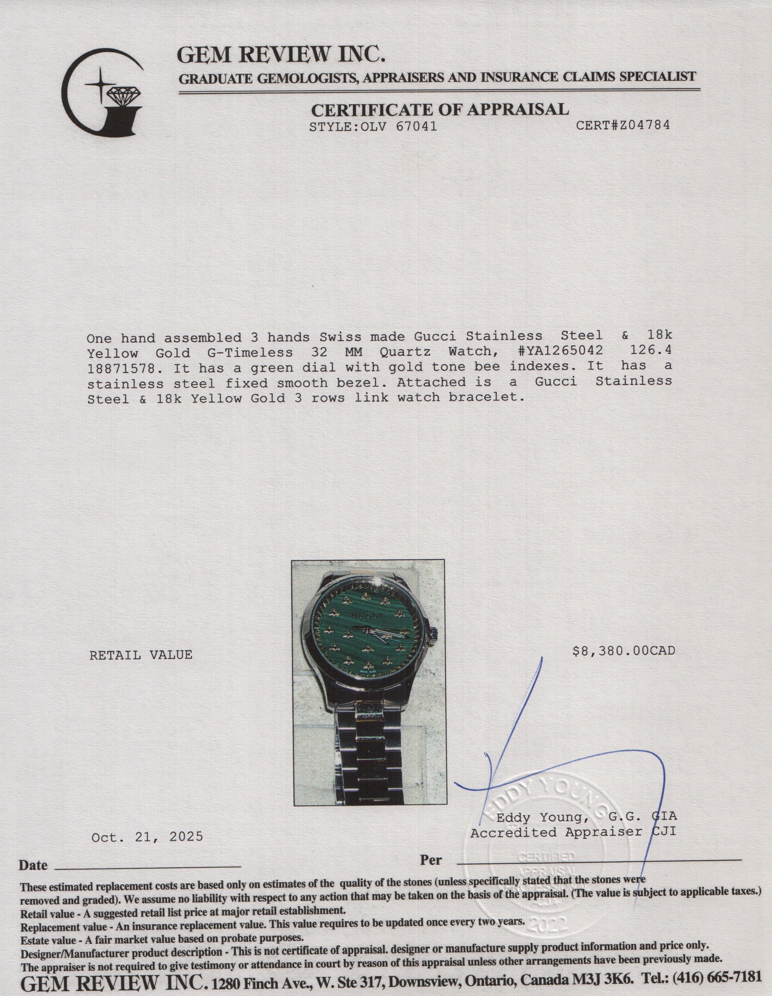 Stainless Steel & 18k Yellow Gold G-Timeless 32 MM Quartz Watch Green Dial YA1265042 w/ Box