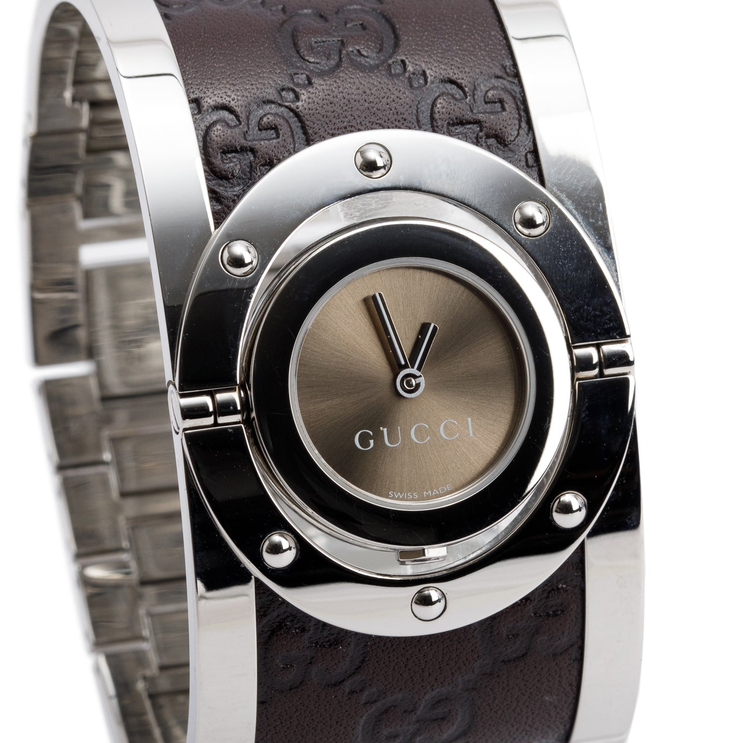 Yellow Gold Plated Stainless Steel & Brown GG Pattern Leather Twirl Watch Brown Rotating Dial YA112433 w/ Box & Papers