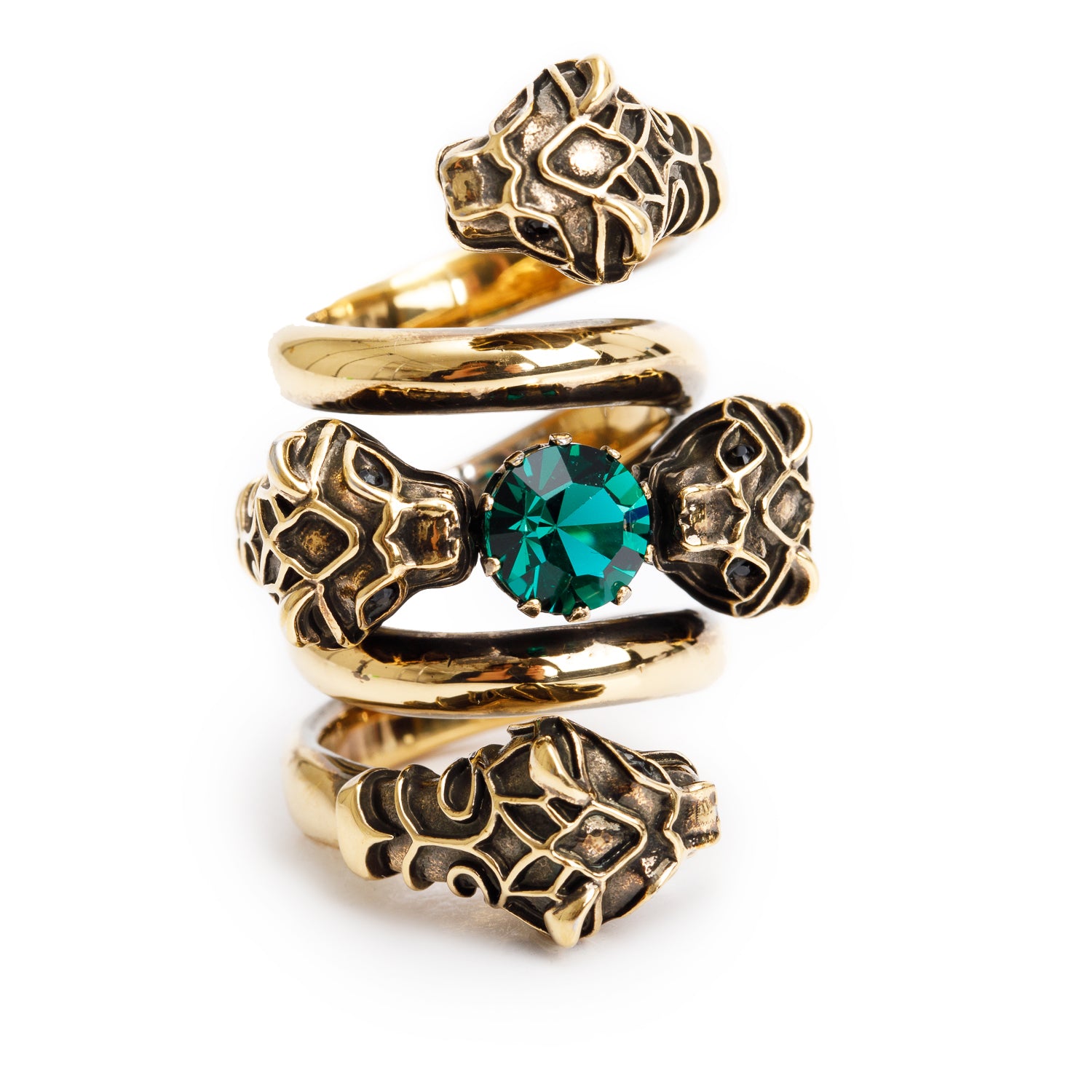 Gold-Tone Metal Green Crystal Double Tiger Head Wrap Ring, Size 14 7