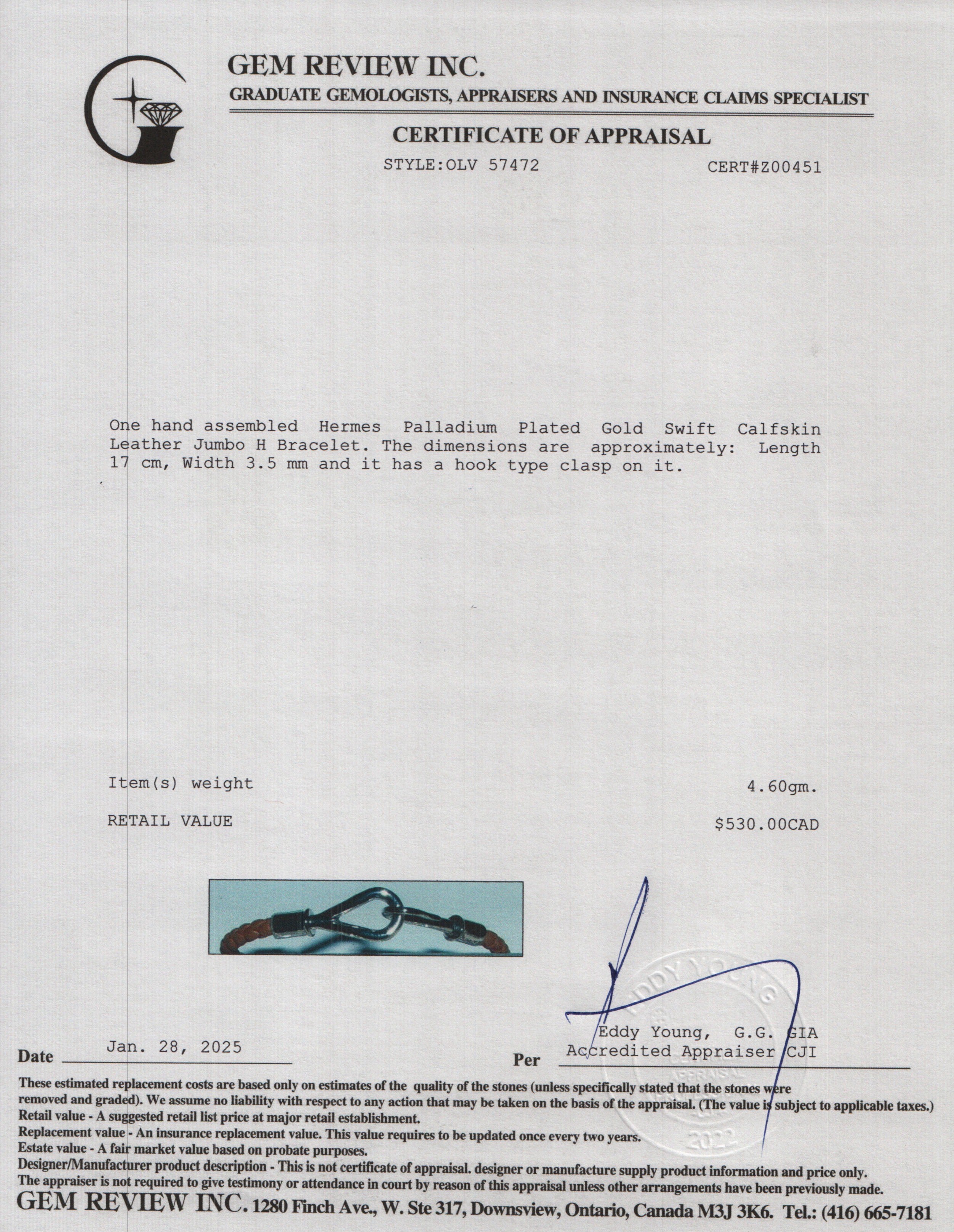 Palladium Plated Gold Swift Calfskin Leather Jumbo H Bracelet w/ Box