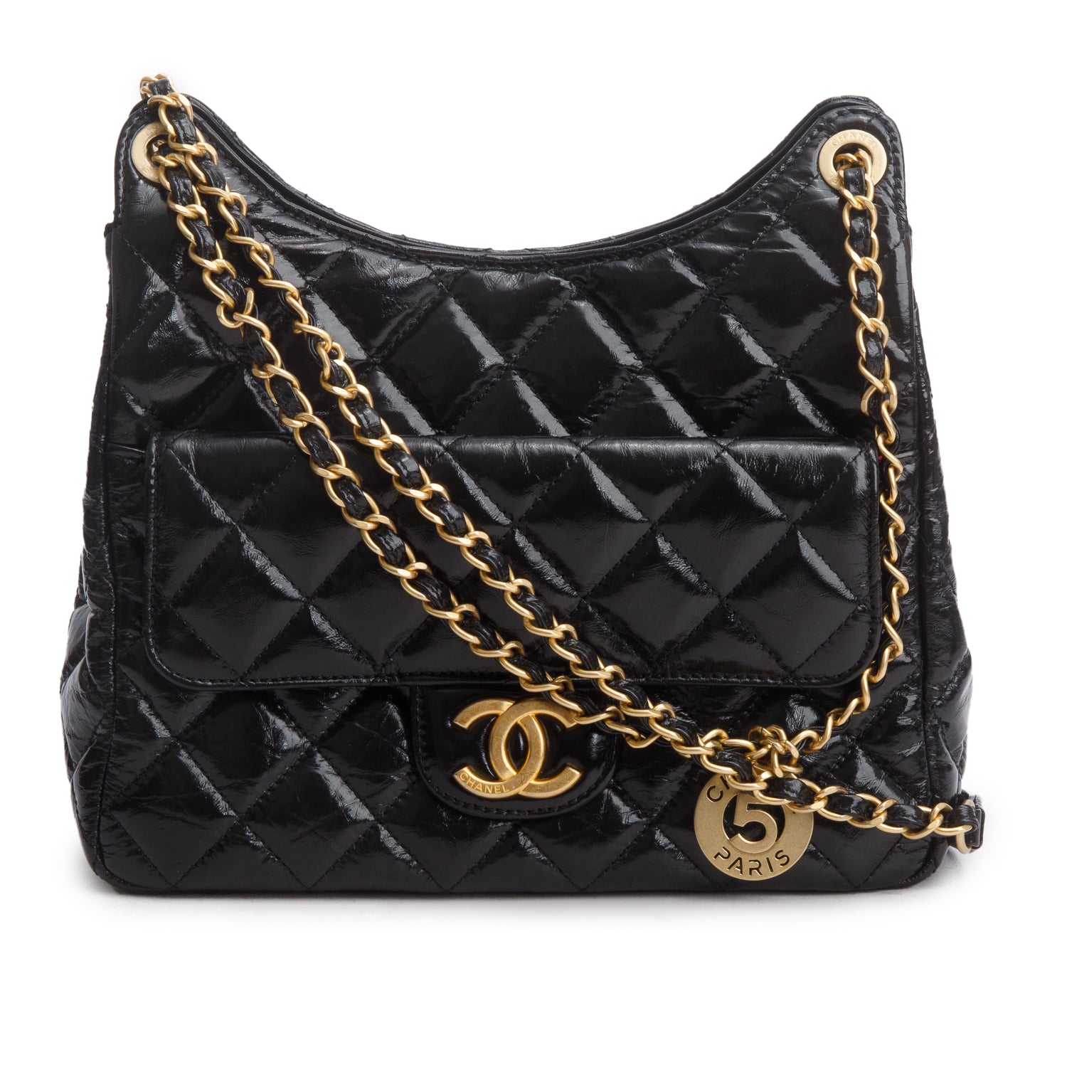 Black Shiny Crumpled Calfskin Quilted Wavy CC Hobo w/ Box