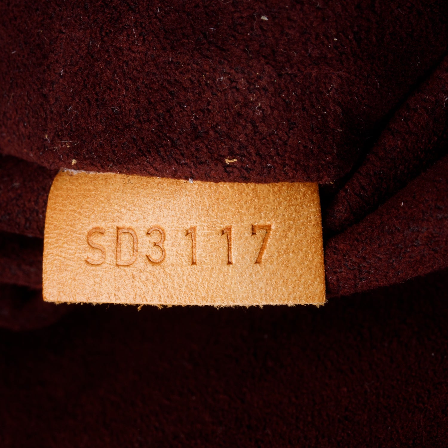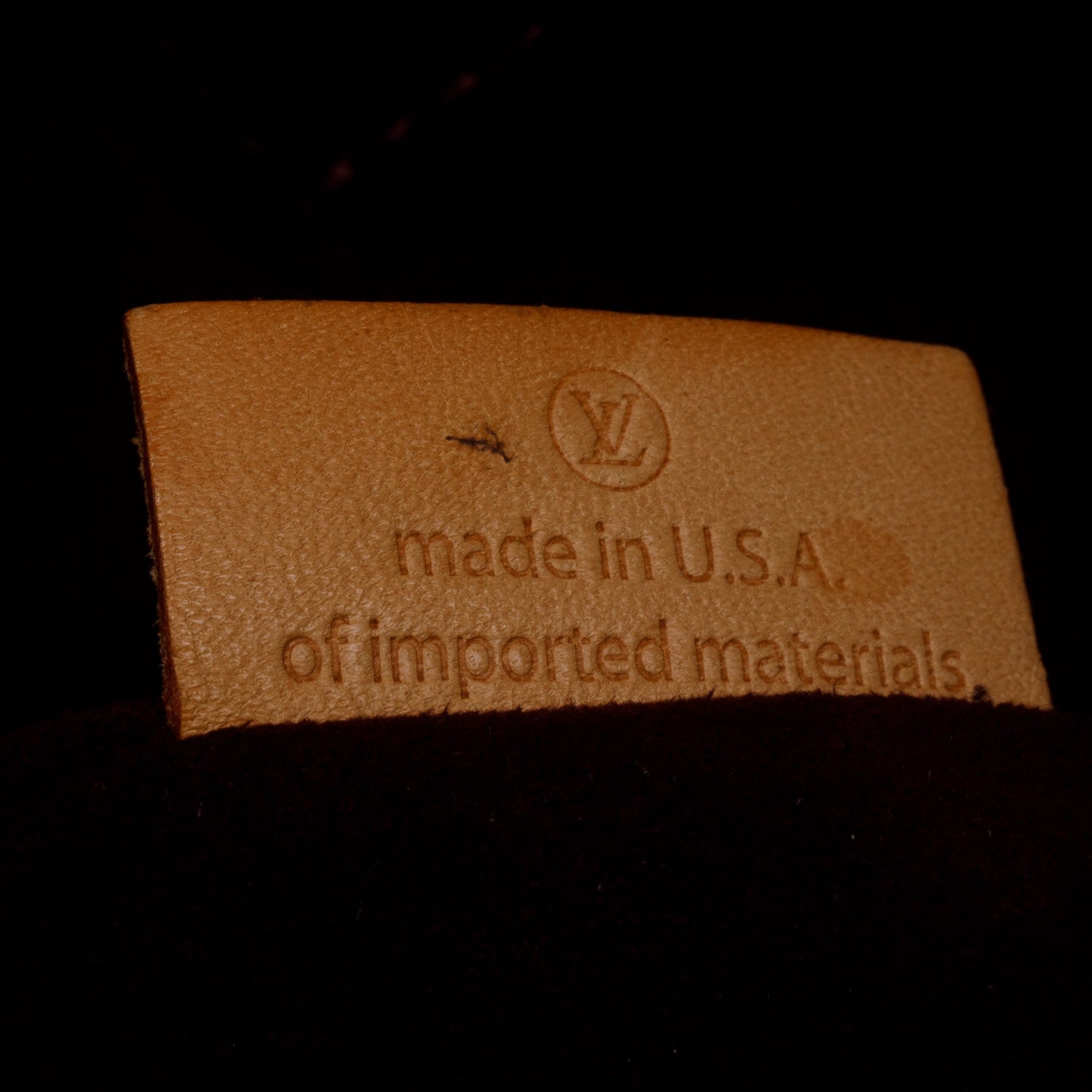 Condition: Very Good; slight scratches and tarnishing at hardware; minor scuffing at exterior corners; slight creasing and marks at strap; initials 'P.G' hot stamped at luggage tag.