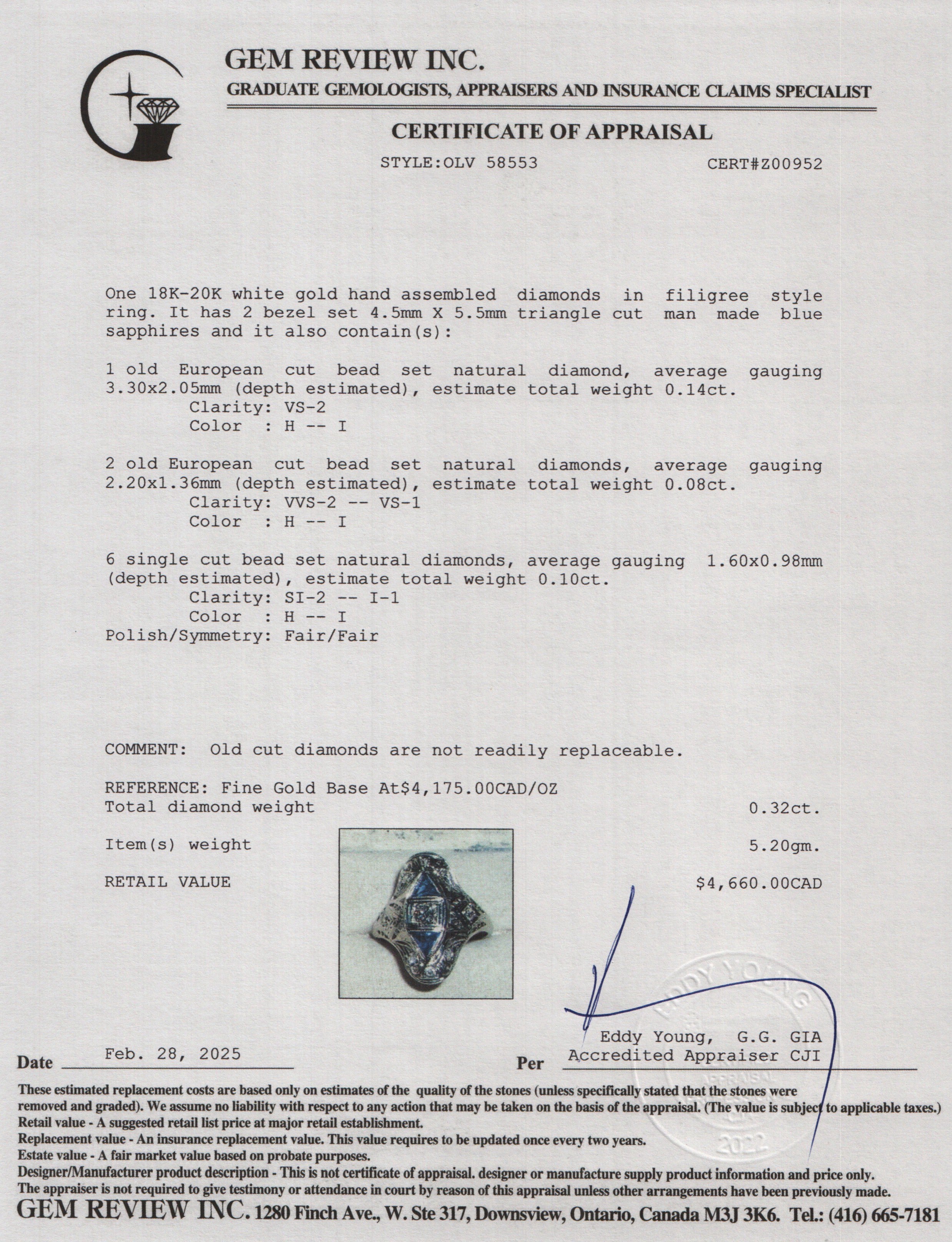 Antique 18k-20k White Gold Sapphire & Diamond Filigree Ring, Size 8.5