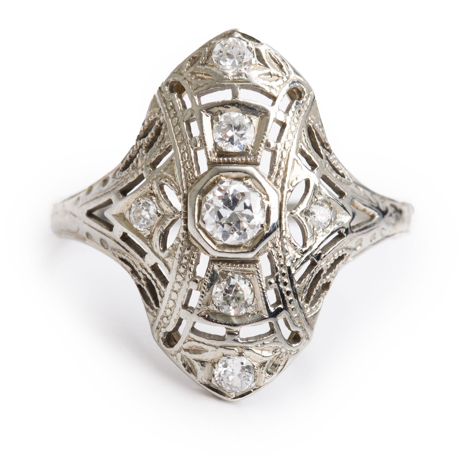 Antique 18k White Gold Diamond Filigree Ring, Size 7.25