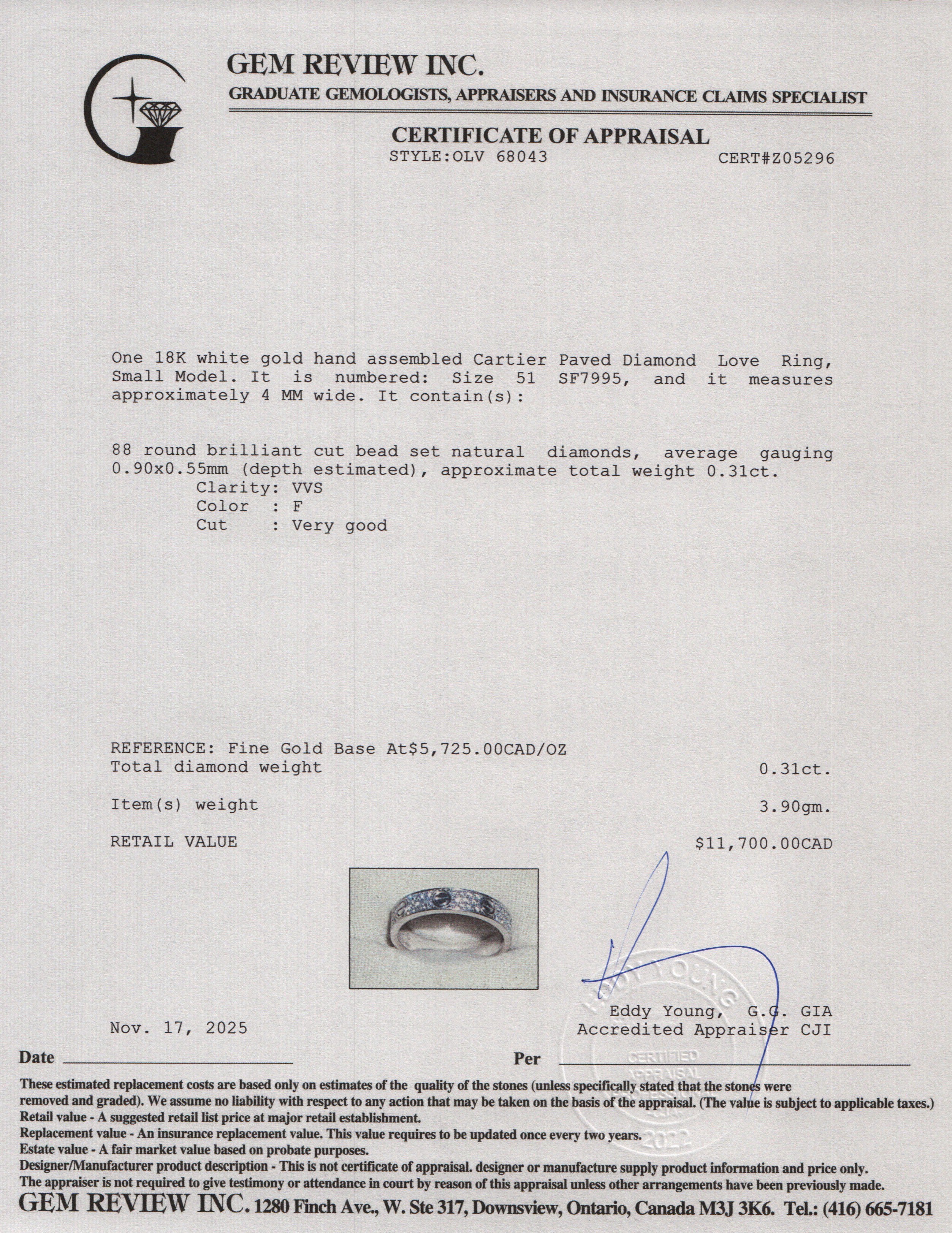 18k White Gold Paved Diamond 4 MM Love Ring, Small Model Size 51 5.75 w/ Box & Certificate