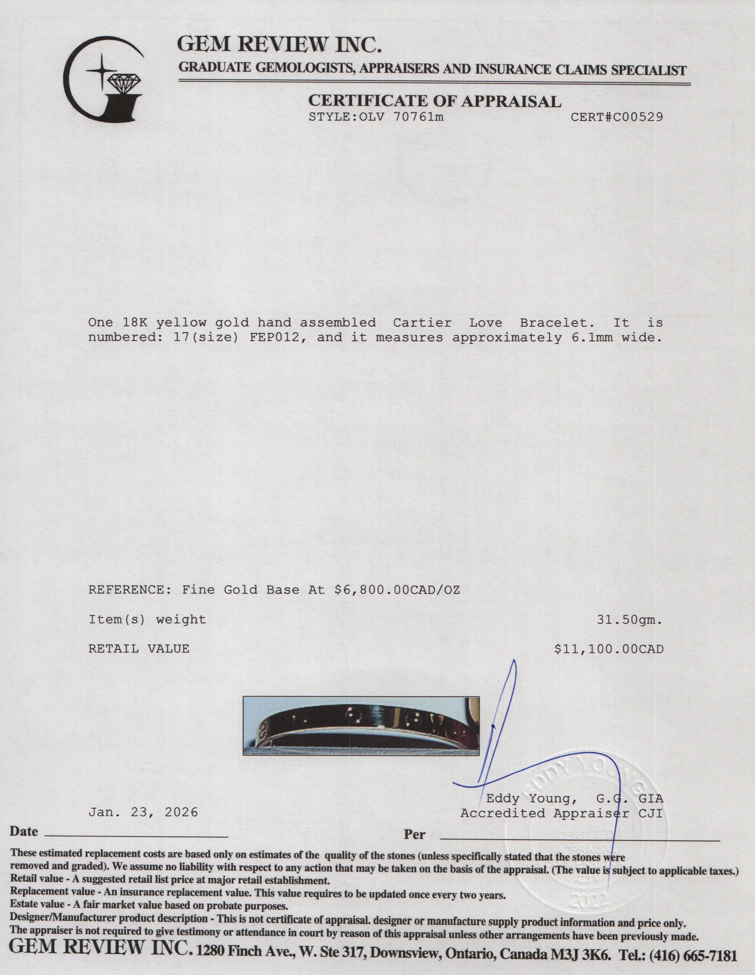 18k Yellow Gold Love Bracelet, Classic Model, Size 17 w/ Box