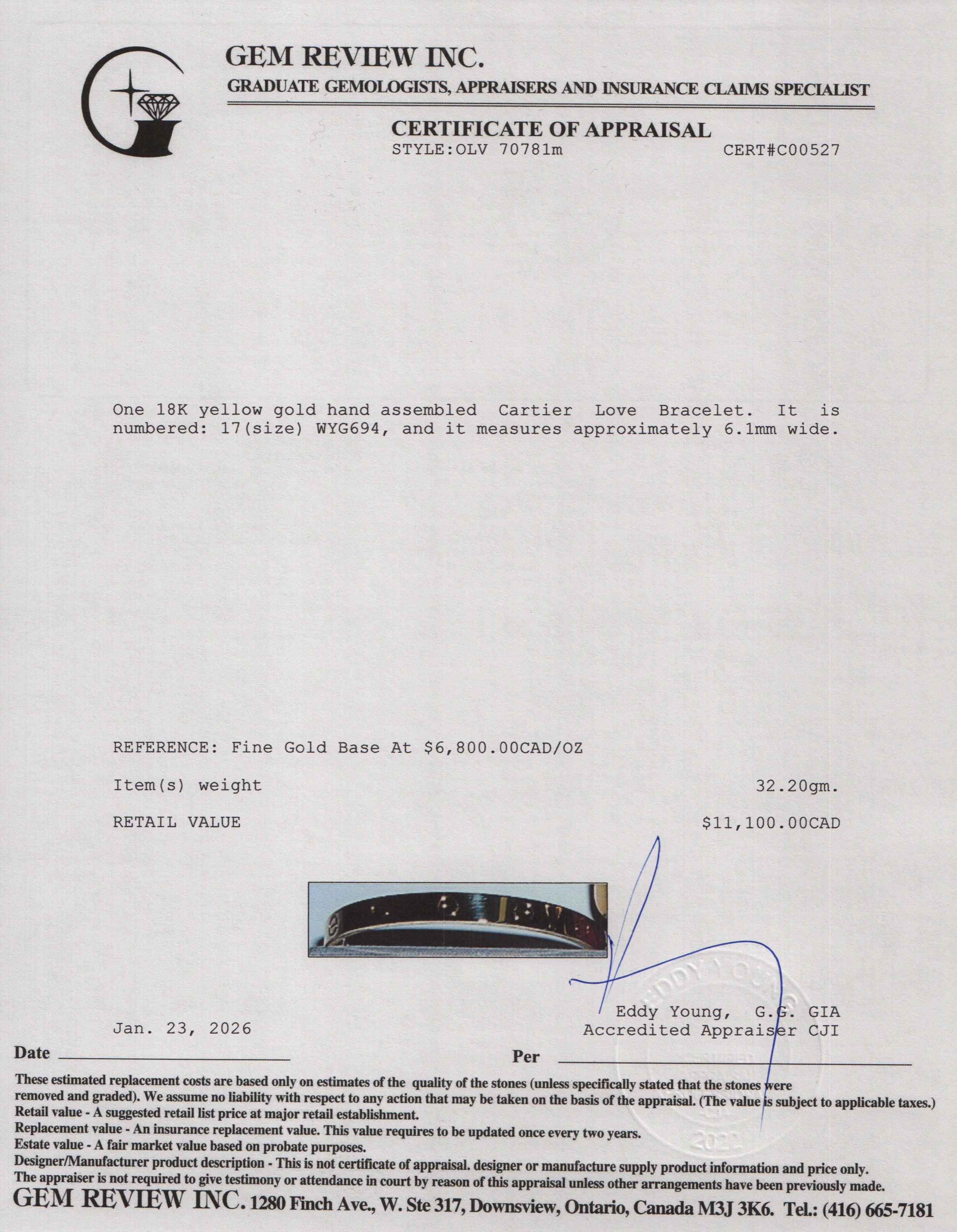 2024 18k Yellow Gold Love Bracelet, Classic Model, Size 17 w/ Box, Receipt & Certificate