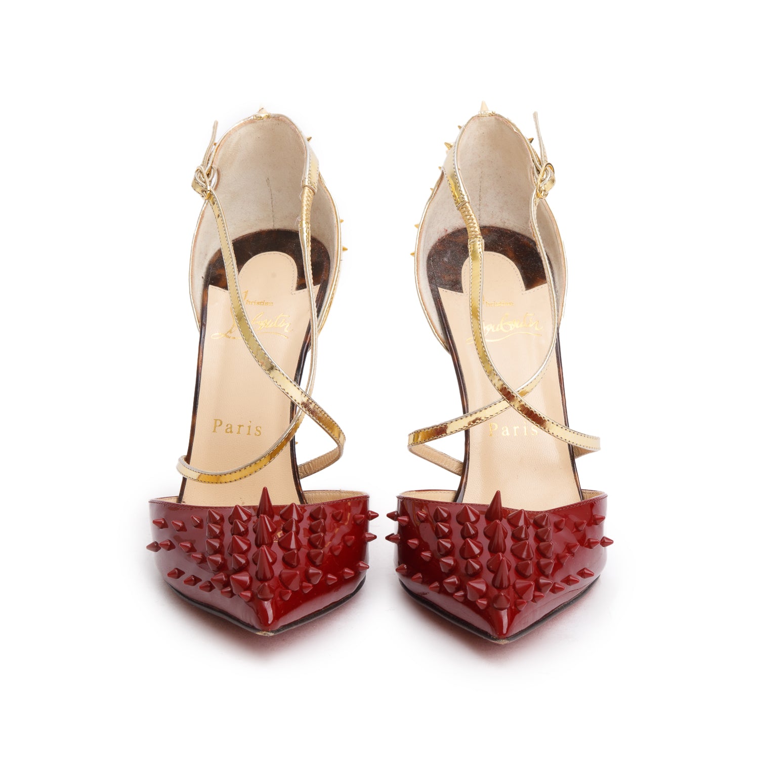 Red Gold Patent Leather Specchio Goldocross Spikes 100 Pumps, Size 37.5