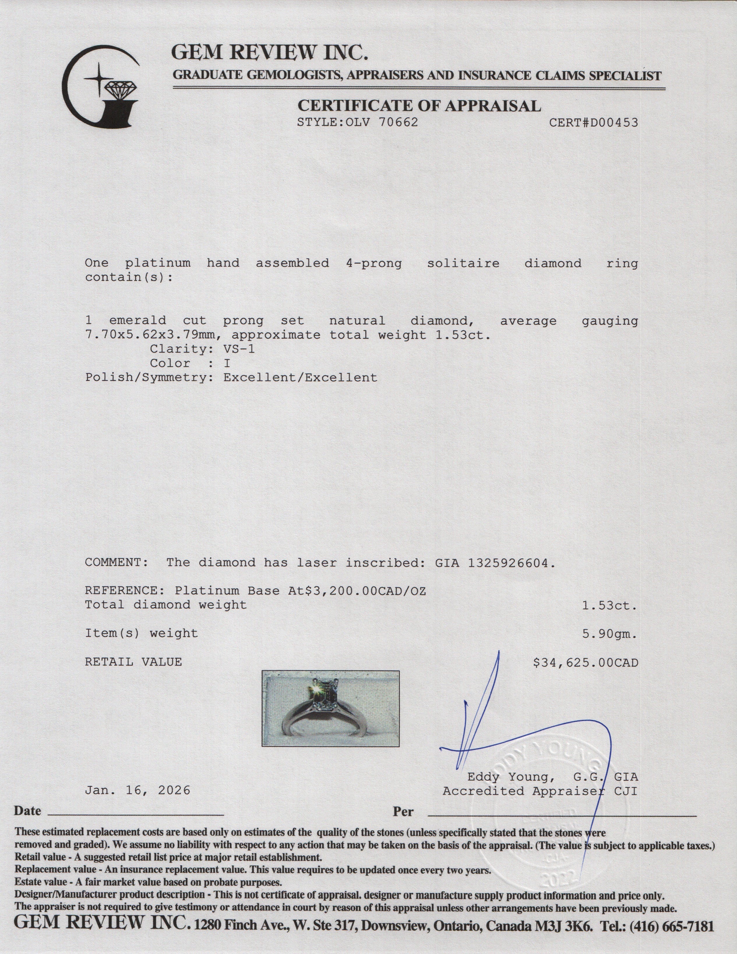 Platinum 1.53 ct. Emerald Cut Solitaire Diamond Engagement Ring, Size 6.5 w/ GIA Certificate