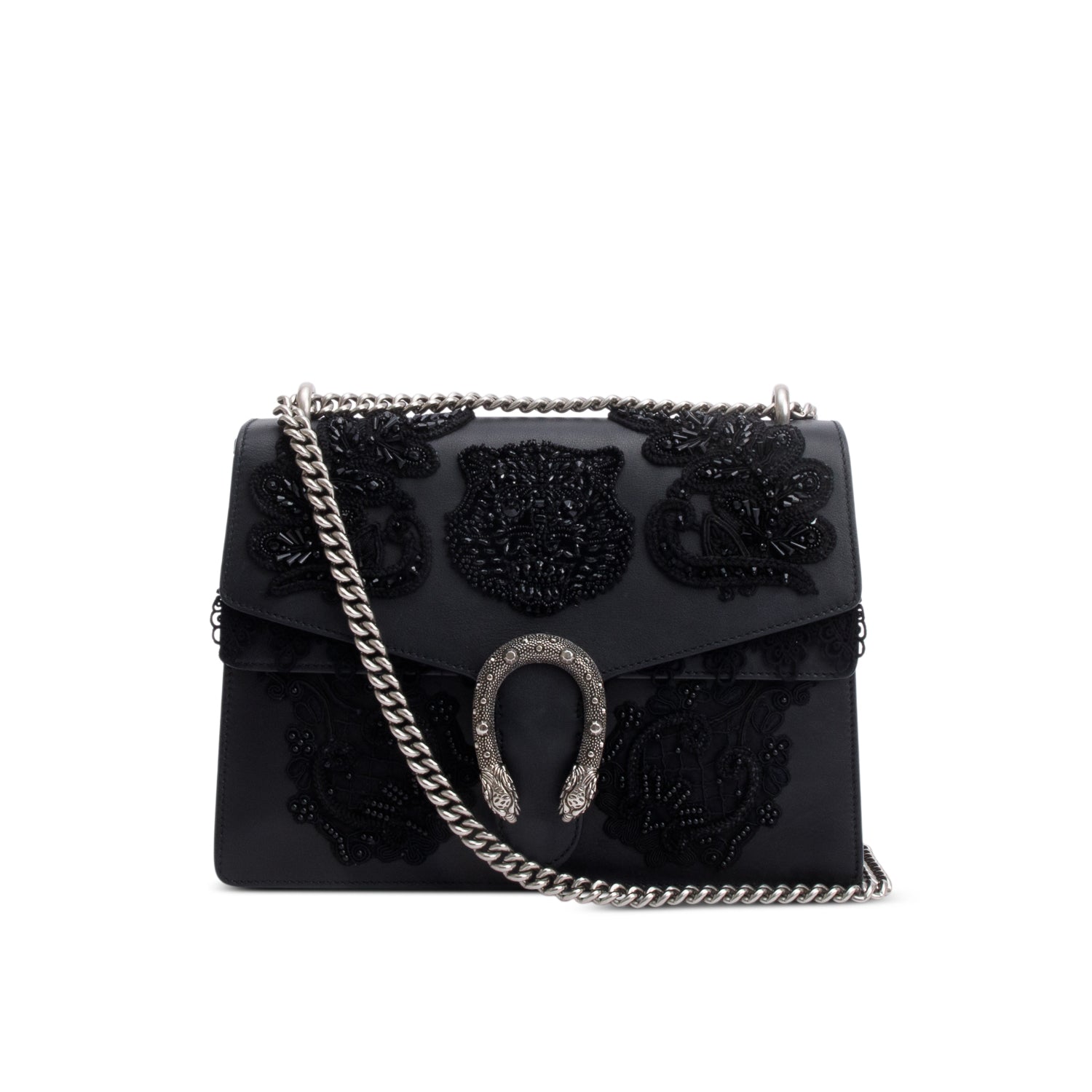 Black Lace Beaded Embellishment Leather Dionysus Medium Shoulder Bag
