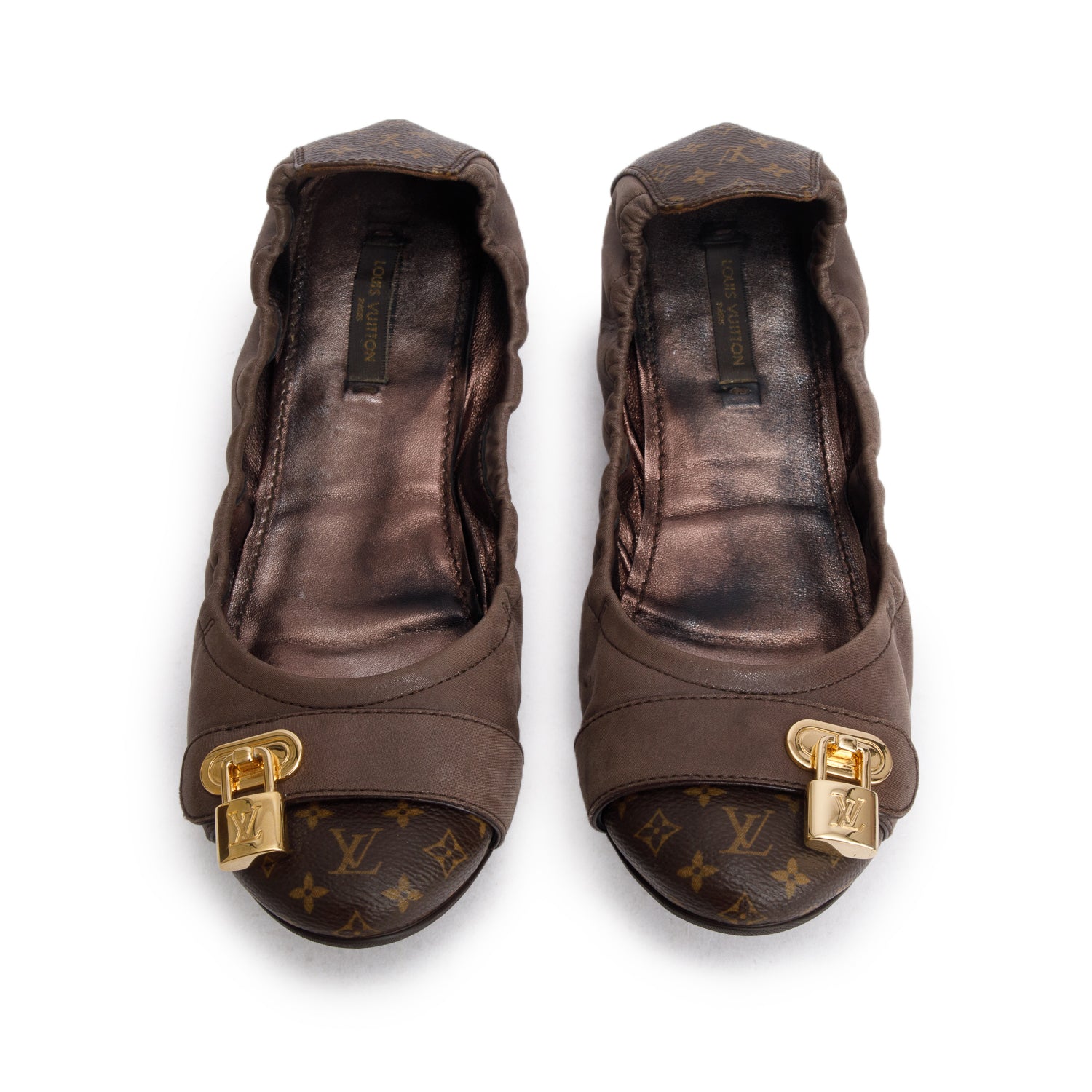 Monogram Taupe Suede Flat Ballerina Shoes, Size 38.5 w/ Box