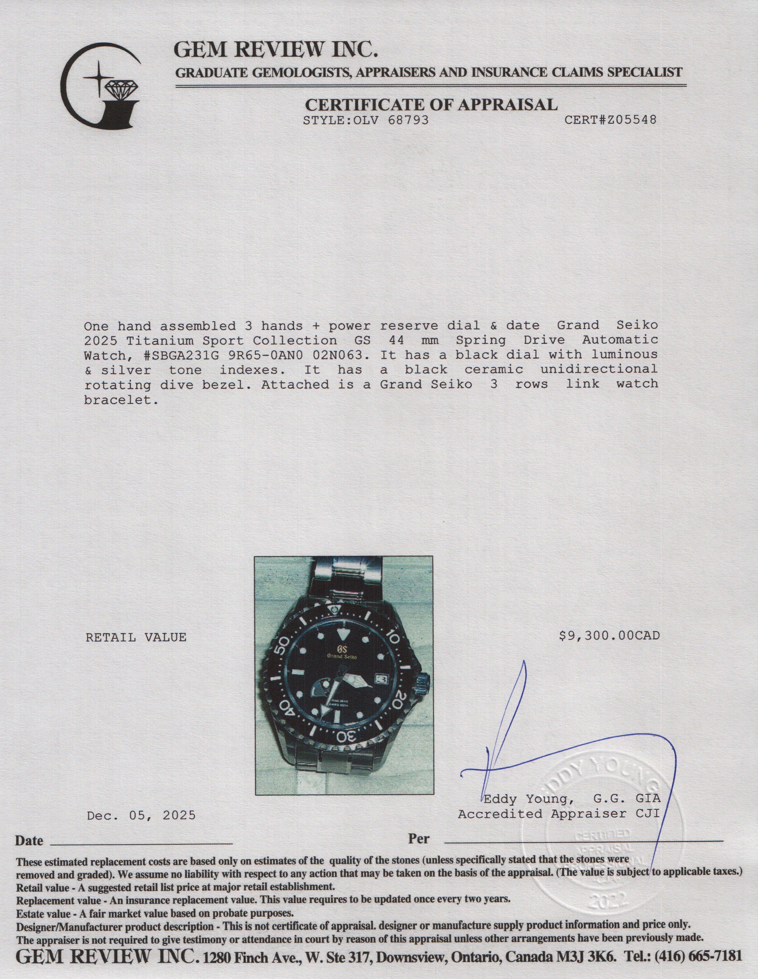 2025 Titanium Sport Collection GS 44 mm Spring Drive Automatic Watch Black Dial SBGN029G w/ Box & Papers
