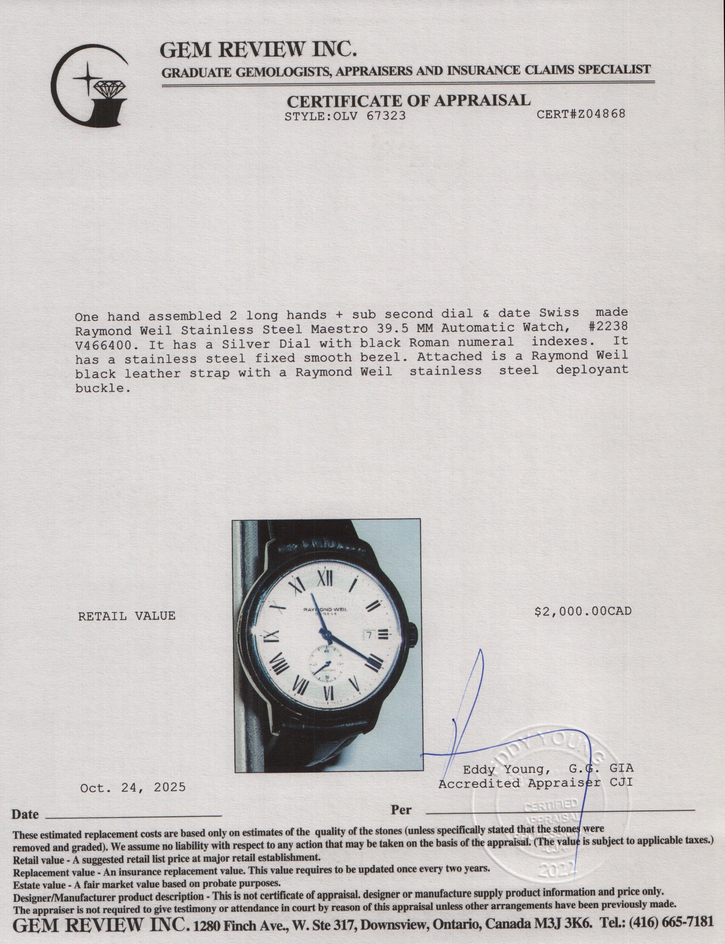 Stainless Steel Maestro 39.5 MM Automatic Watch Silver Dial 2238 w/ Box