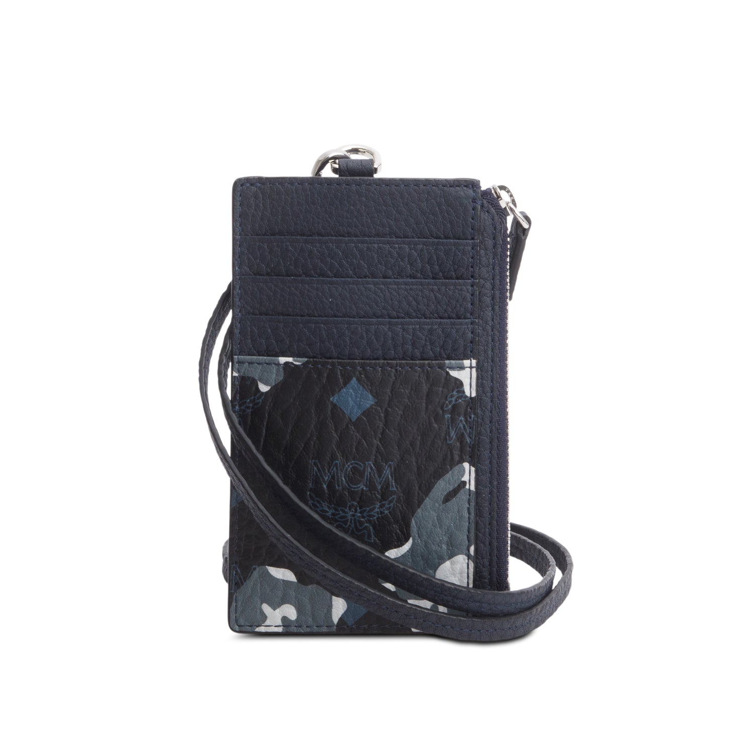 Navy Leather Camo Print Portuna Card Holder w/ Box & Strap