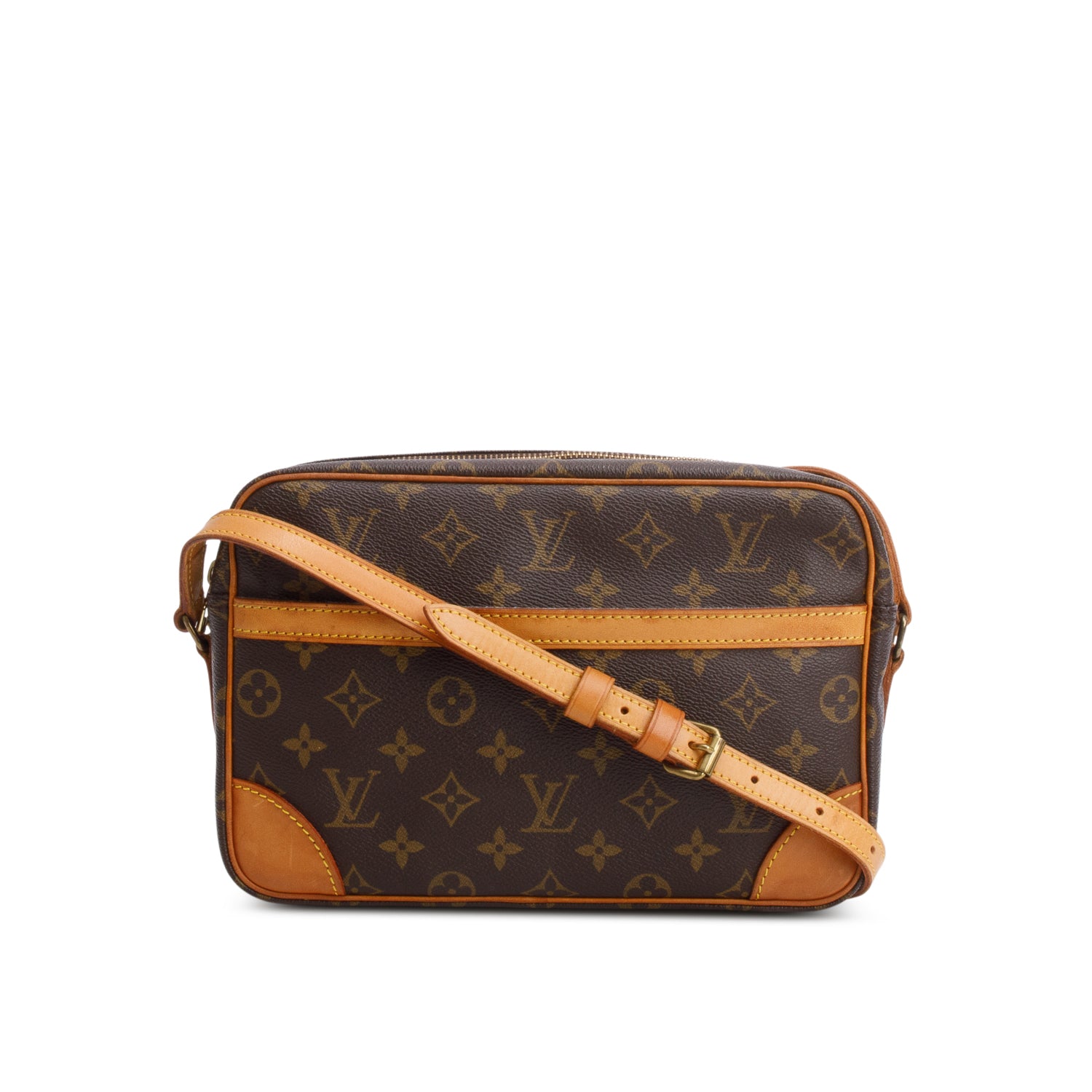 Condition: Very Good; slight scratches and discoloration at exterior vachetta and strap; slight marks and creasing at interior.