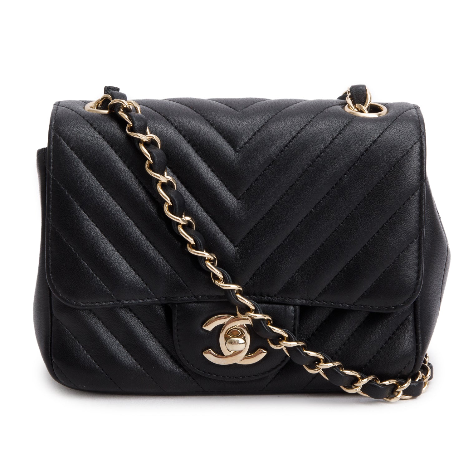 Black Lambskin Chevron Quilted Mini Square Flap Bag w/ Authenticity Card