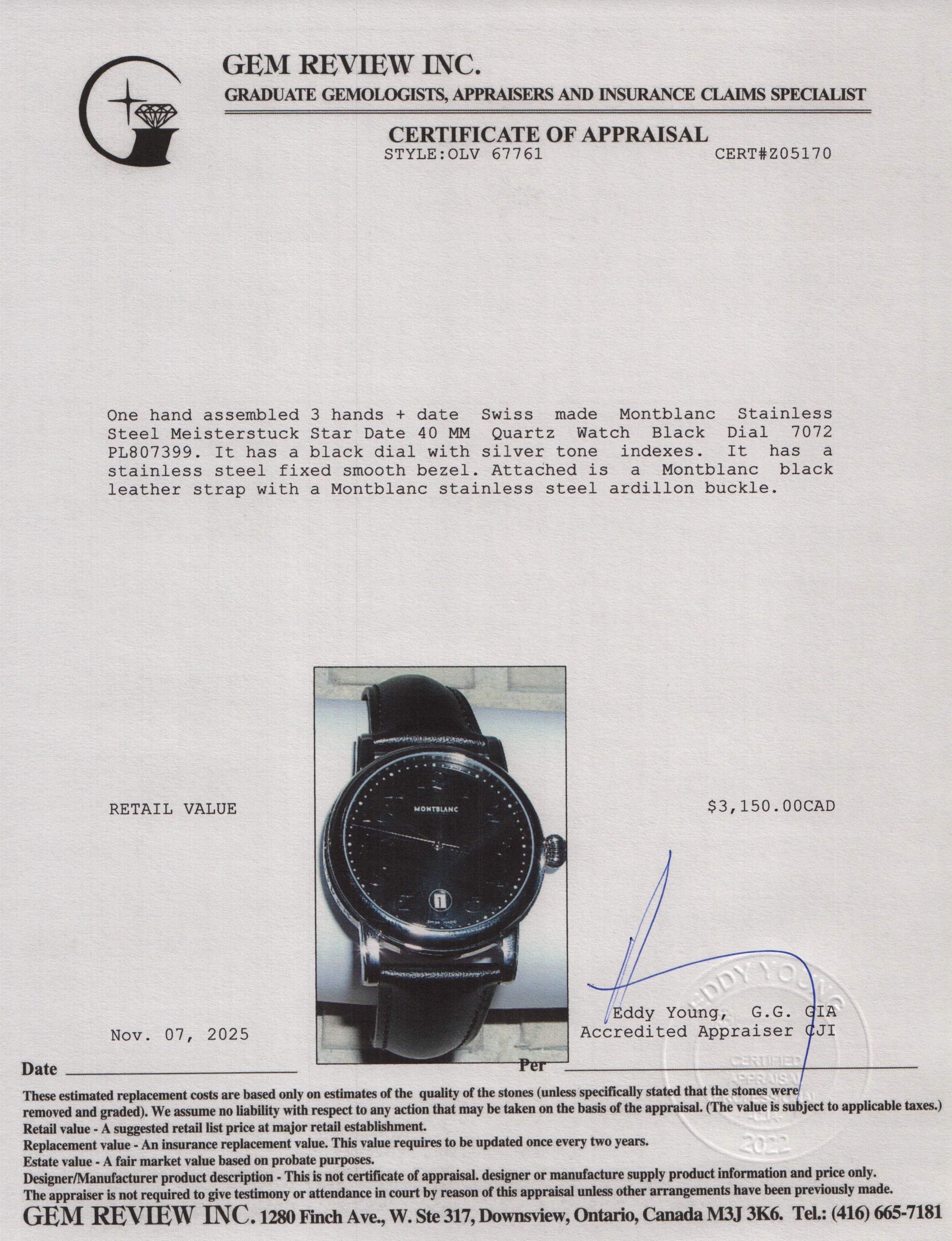 Stainless Steel Meisterstuck Star Date 40 MM Quartz Watch Black Dial 7072 w/ Box