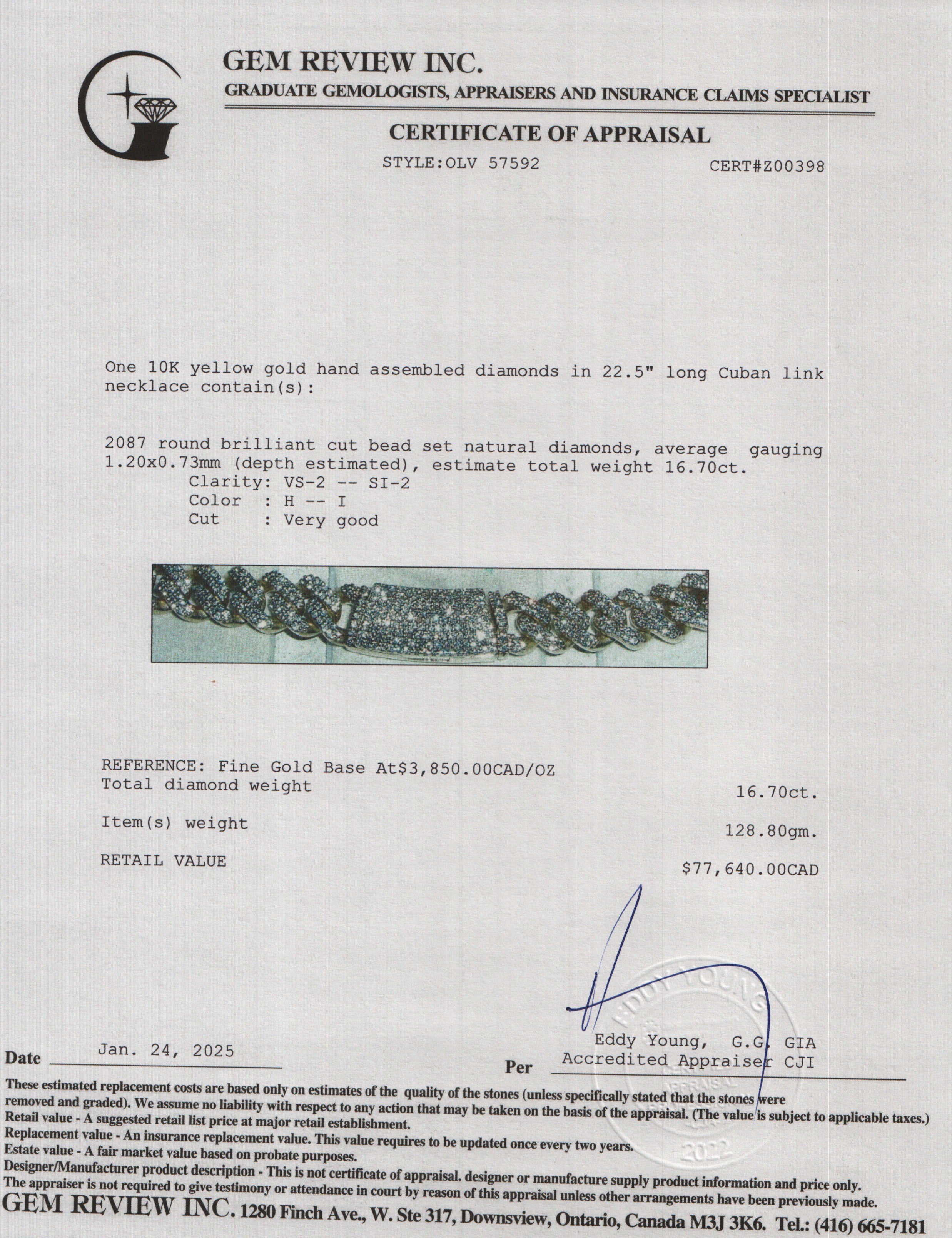 10k Yellow Gold 16.70 tcw. Pave Diamond Cuban Link Necklace