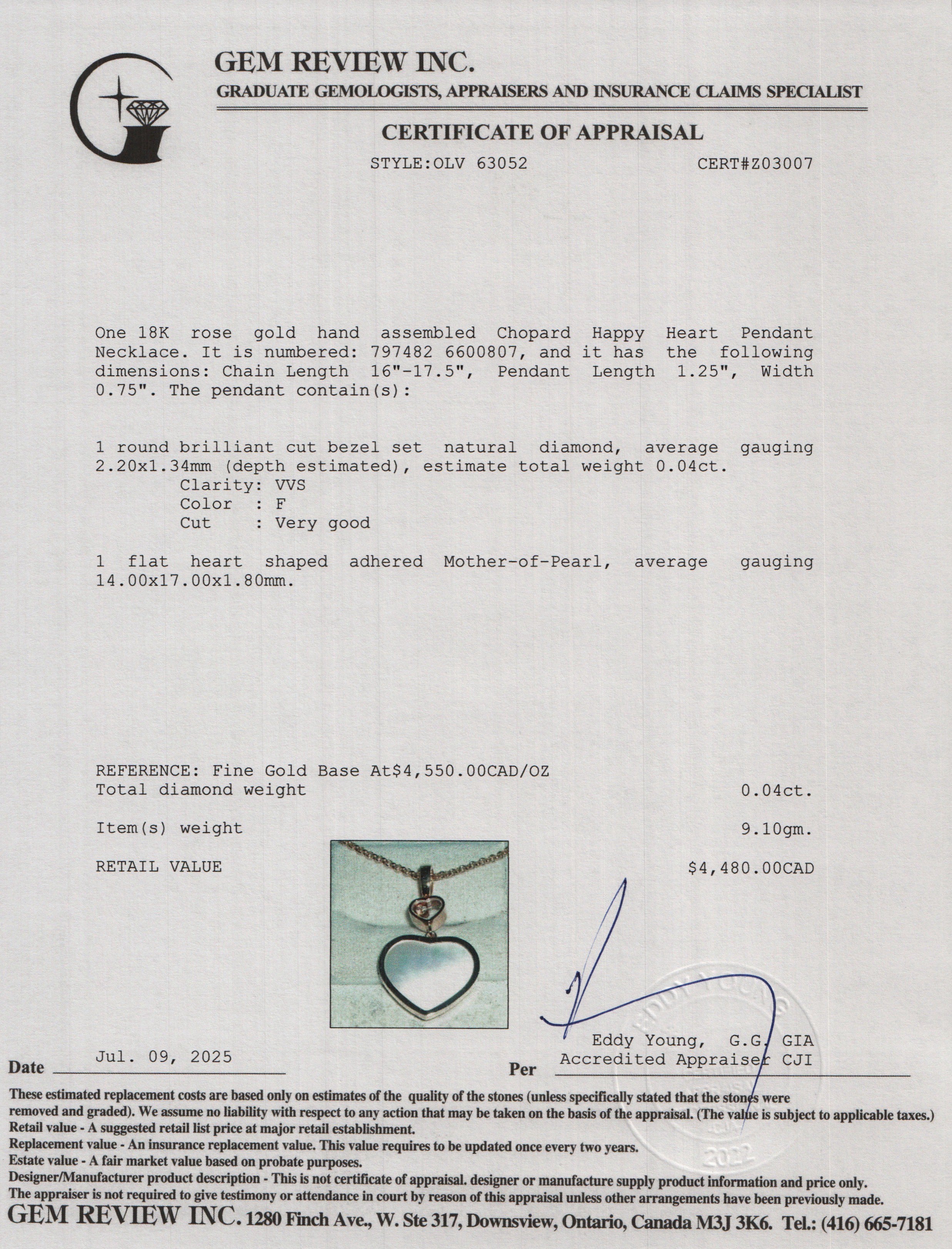 18k Rose Gold Mother of Pearl Diamond Happy Heart Pendant Necklace w/ Box & Certificate